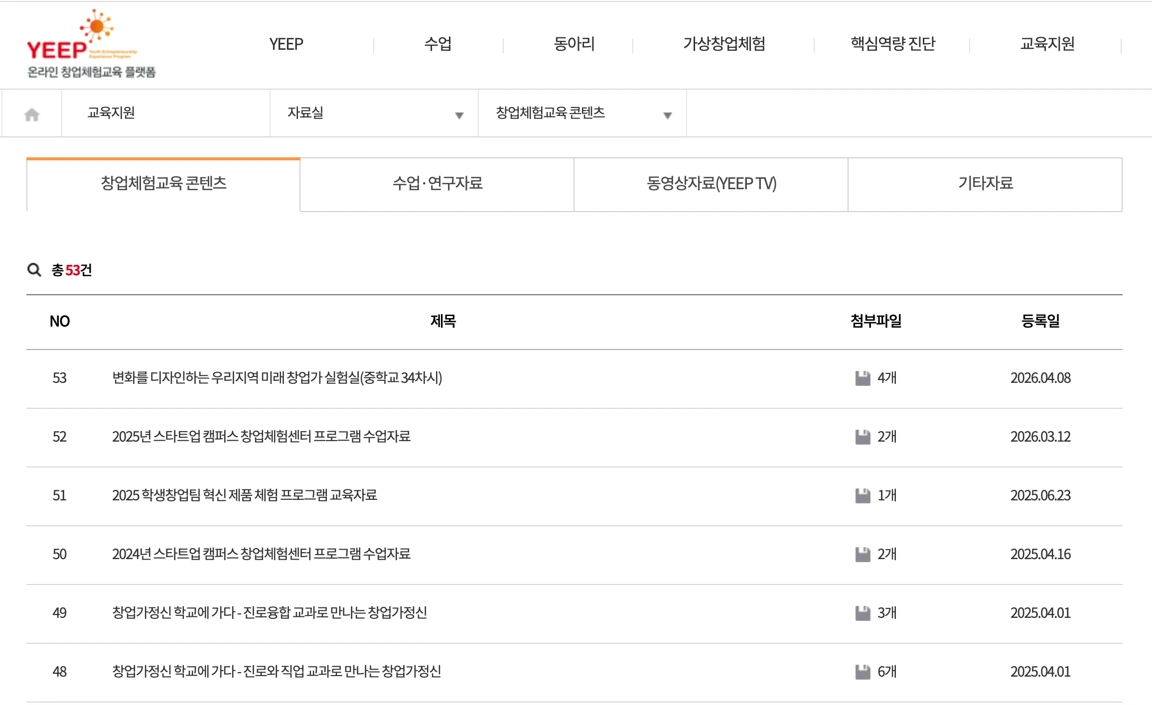 YEEP 창업체험교육 콘텐츠 | 50 | 2024년 스타트업 캠퍼스 창업체험센터 프로그램 수업자료 | 2025.04.16 | 창업가정신, 4차 산업혁명 관련 신기술 등의 주제별 창업가정신 함양 교육 프로그램(3~6차시)으로 구성 | ||