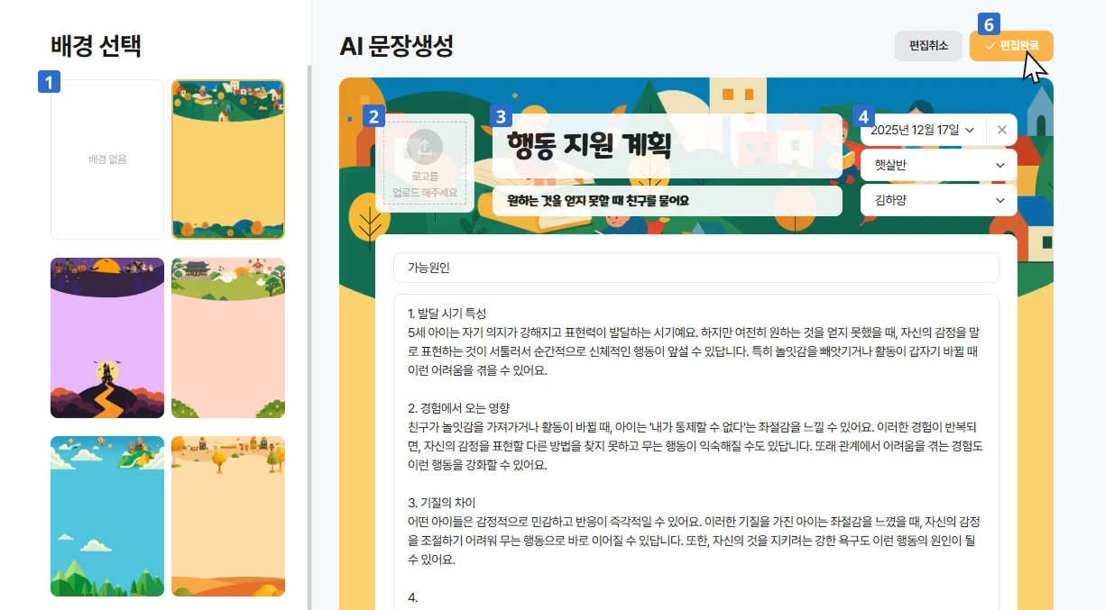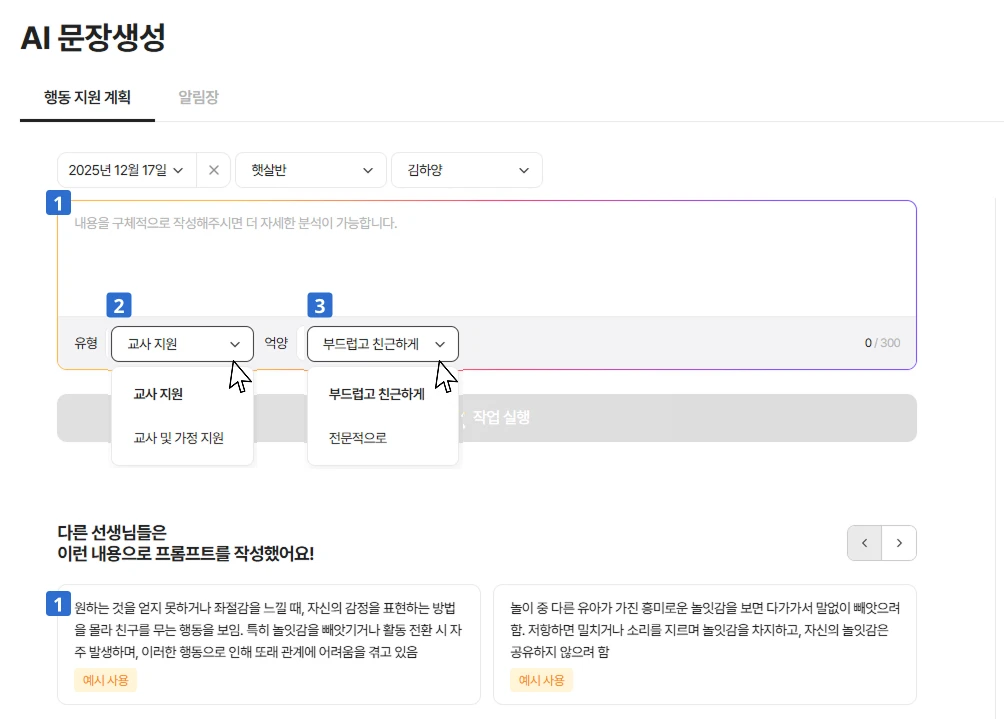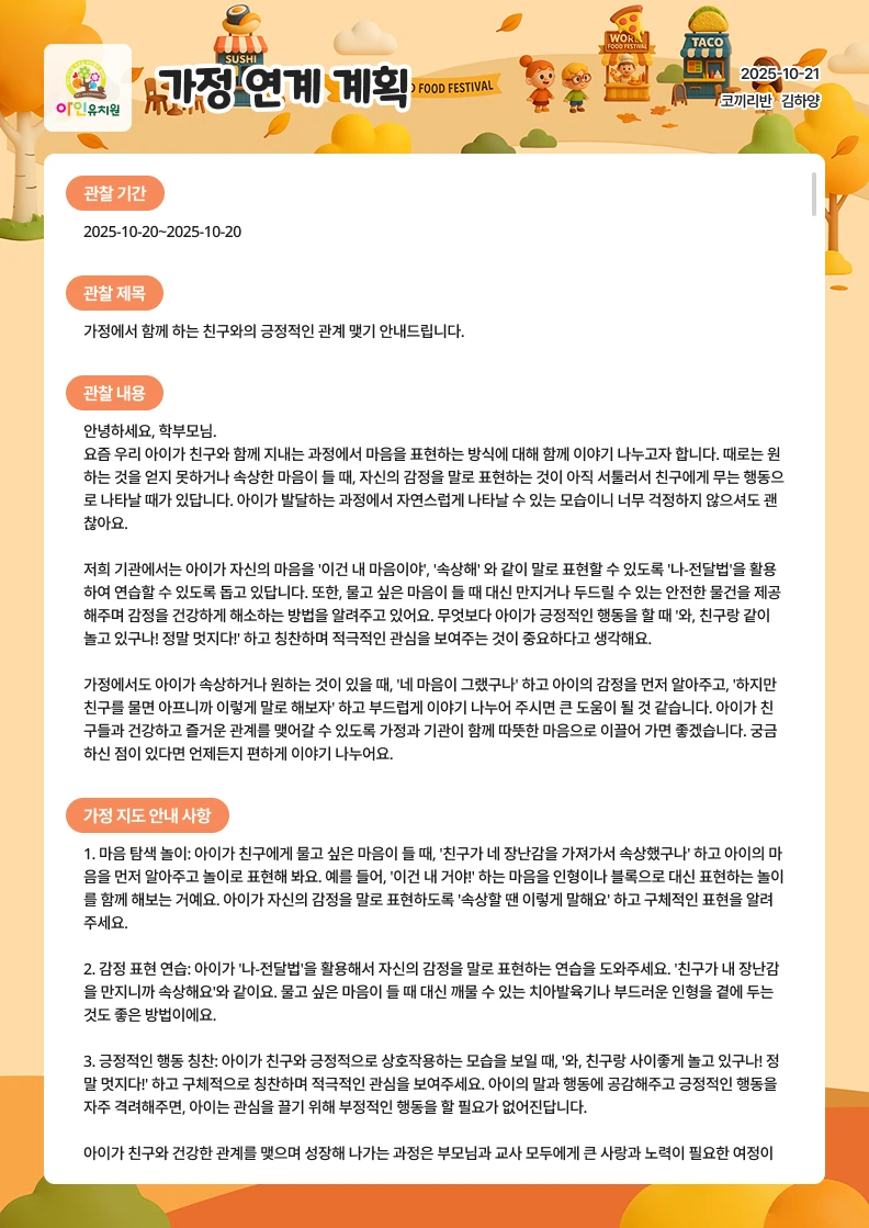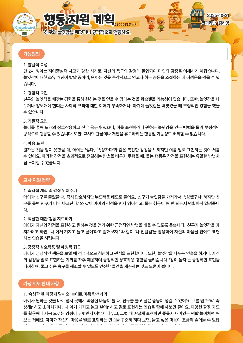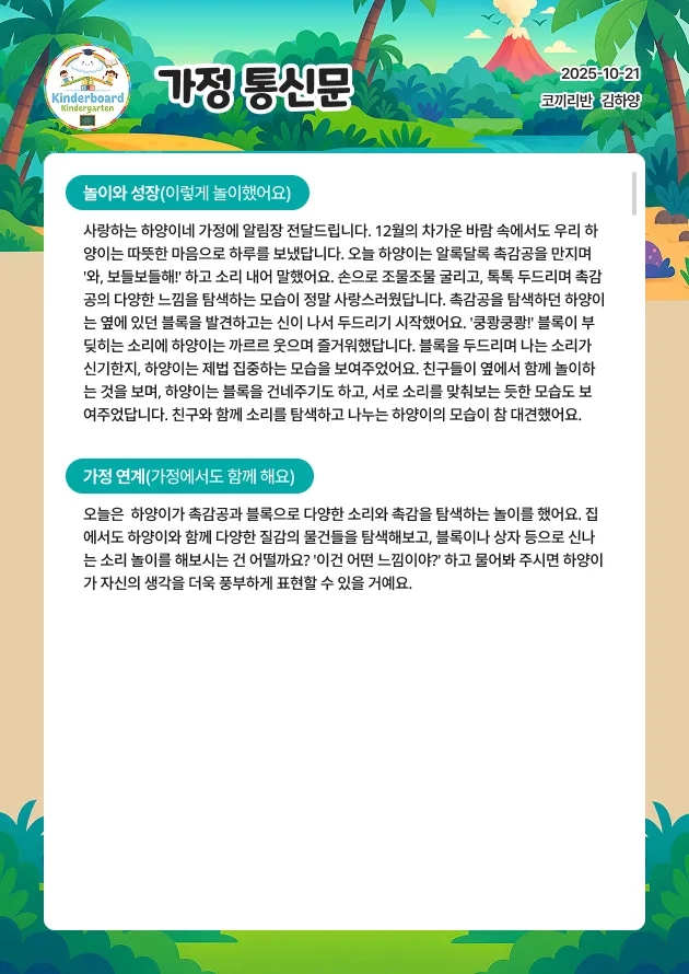 놀이 준비물부터 설계 배경, 교육 내용, 연계 활동까지 한 번에! 수업 준비할 때 매번 새로운 주제와 활동 자료를 찾는 일, 정말 어려우셨죠? 이제 킨더보드가 키워드만 입력하면, AI가 누리과정 5개 영역과 표준보육과정이 연계된 맞춤 놀이 계획을 완성해 줍니다. 1️⃣ 킨더보드에 로그인하신 후 상단 메뉴 중 '업무 보드' → '놀이 계획'을 클릭해 주세요. 2️⃣ 놀이를 진행할 아이들의 '연령'과 '시간'을 선택해 주세요. 3️⃣ 원하는 놀이 주제를 입력하거나 놀이 사진이 있다면 업로드해보세요, AI가 사진을 분석해 놀이 키워드를 추천해줘요. 원하는 놀이 주제를 입력 후 '놀이계획 생성하기'를 클릭하세요. 주요 놀이 주제나 상세한 문장 등을 입력해 주셔도 좋아요. 4️⃣ 생성하려는 놀이계획 유형을 선택할 수 있어요. 놀이아이디어: 다양한 아이디어를 얻고싶을 때 이용해보세요. 놀이 계획(요약): 놀이 흐름과 발문 예시가 포함된 간단한 놀이 계획 작성시 이용해보세요. 놀이 계획(상세): 놀이 환경, 설계 배경, 대체 활동까지 담겨 있어 발표·공개 수업 등 심도 있는 수업 준비에 이용해보세요. 실제 생성된 놀이계획 샘플을 확인해보세요.(클릭하면 크게 볼 수 있어요.)