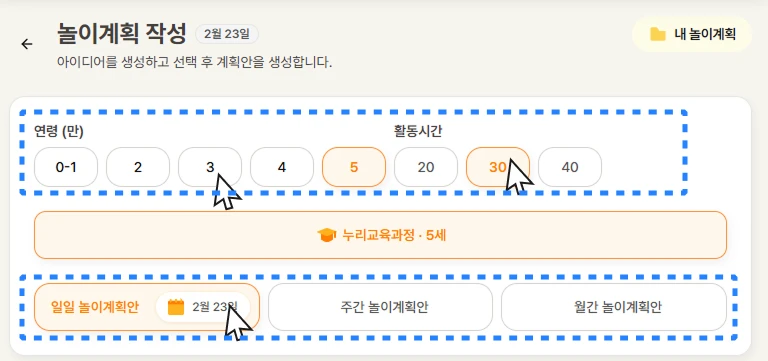 2. 놀이를 진행할 아이들의 '연령'과 '활동 시간'을 선택해 주세요.