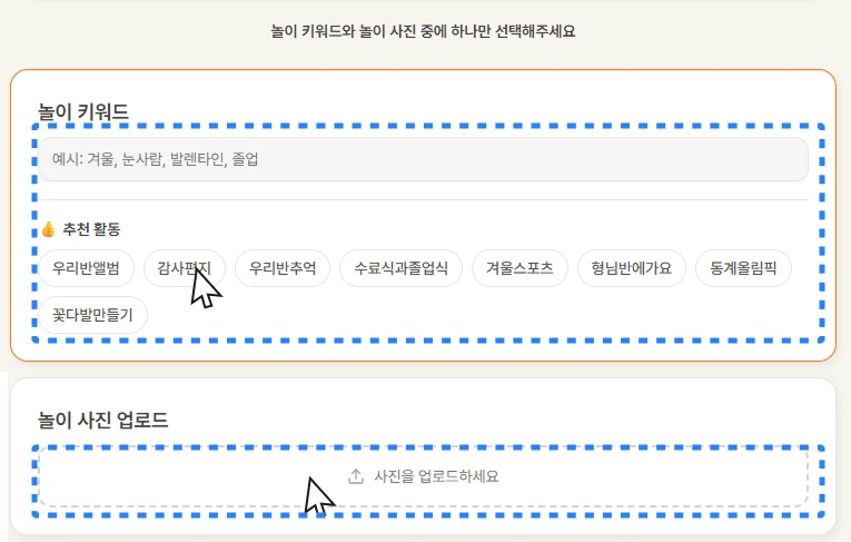이제 킨더보드가 키워드나 놀이사진만 입력하면, 누리과정 및 교육과정 기반 놀이 아이디어를 제시해줘요,