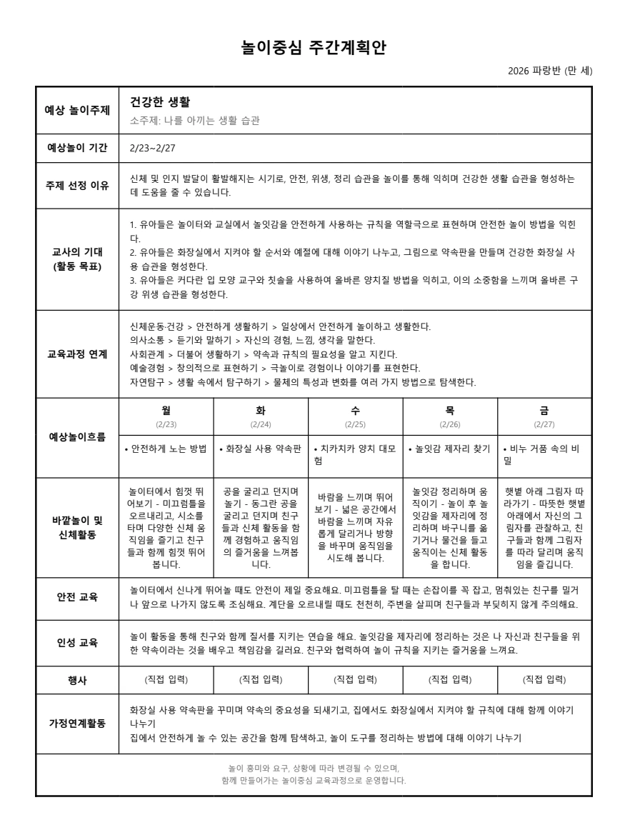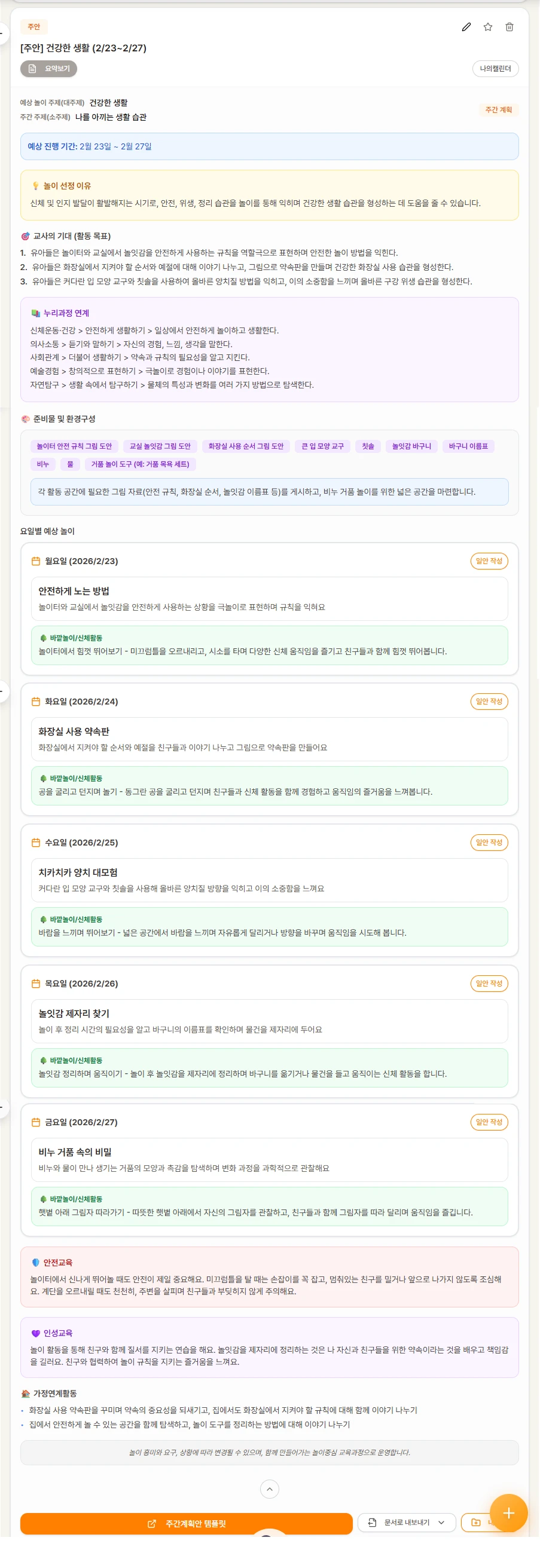 2️⃣ 주안: 일주일 활동에 대한 주간 계획안으로 요일별 예상 놀이를 포함해요.
