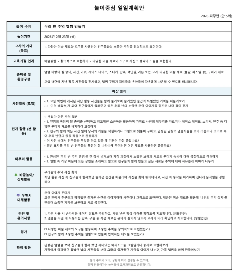 1️⃣ 일안 : 하루 활동을 위한 상세 놀이계획안으로