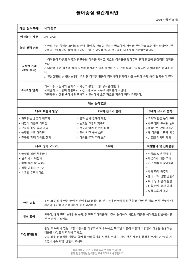 3️⃣ 월안: 한달 활동에 대한 월간계획안으로 주차별 예상 놀이를 포함해요.