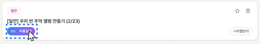 저장한 놀이계획 목록에서 검색이 필요한 계획안의 '자료검색' 버튼을 클릭해보세요.
