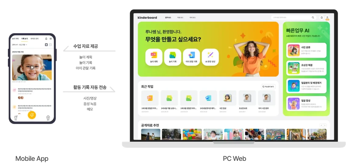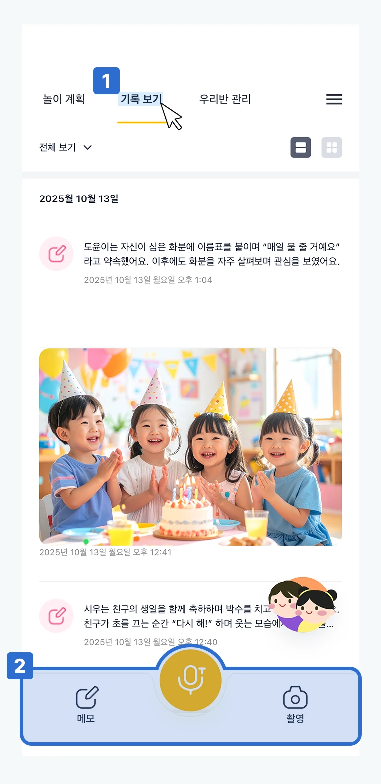 킨더보드 앱 기능별 사용법 💡 앱 주요 기능 소개 킨더보드 앱의 기본적인 구조는 이렇게 되어 있어요. 차근차근 살펴보며 활용 방법을 익혀보세요! 1️⃣ 웹으로 생성한 '놀이 계획'을 바로 확인할 수 있는 '놀이 계획' 상단 메뉴 중 '놀이 계획'을 선택하면, 웹에서 생성한 계획을 바로 확인할 수 있어요. 검색을 통해 원하는 놀이 계획을 찾고 수업 중에도 간편하게 참고할 수 있어요. 2️⃣ 아이들 사진이나 관련 메모를 정리할 수 있는 '기록 보기' 상단 메뉴 중 '기록 보기'를 클릭하면, 이전에 업로드한 사진이나 메모를 모아볼 수 있어요. 하단 메뉴 탭 중 원하는 기록 유형의 버튼을 클릭해 바로 기록을 남겨보세요. 메모: 텍스트로 기록을 남겨요. 음성 녹음: 상황을 실시간으로 녹음해요. 촬영: 사진을 새로 찍거나 기존 사진을 업로드해요. * 앱으로 올린 사진은 기본적으로 기기에 저장되지 않아, 용량 걱정 없이 관리할 수 있어요. (설정에서 변경 가능) 🍯 Tip. 특정 아이의 기록을 남기고 싶다면? '기록 보기' 탭 하단 '아이들 일러스트'를 클릭한 후 기록을 남기고 싶은 아이의 얼굴 → 원하는 기록 유형을 클릭해 소중한 순간을 실시간으로 남겨보세요.
