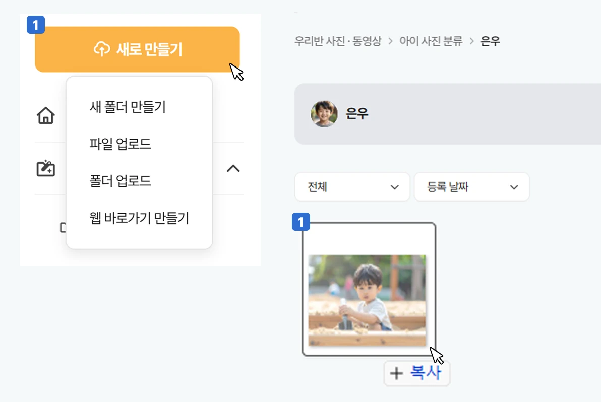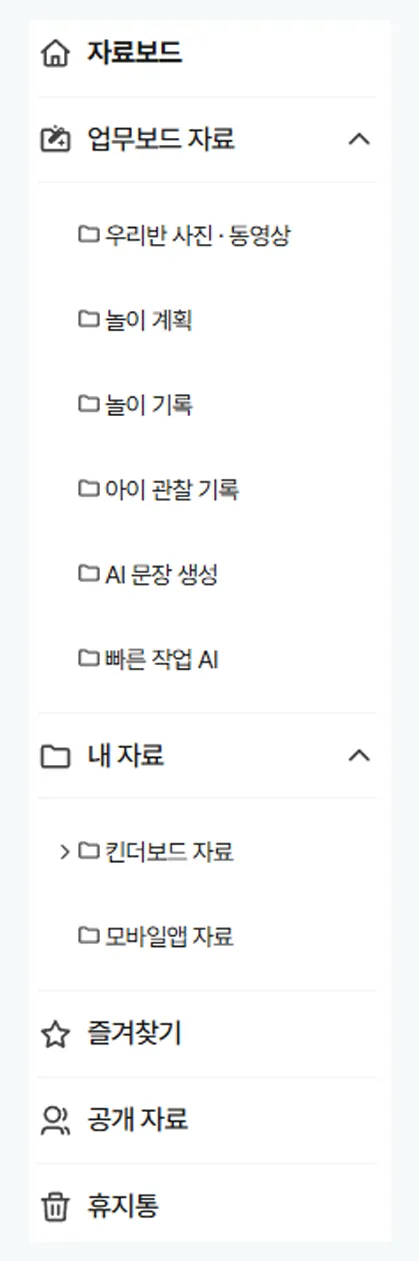업무 관련 각종 파일을 통합 관리할 수 있어요! 수업 자료, 아이들 사진·영상, 도안…. 파일이 너무 많아 복잡하셨죠? 이제 킨더보드로 흩어져 있던 모든 파일을 한 곳에 안전하게 보관하고 정리하세요! 1️⃣ 킨더보드에 로그인하신 후 상단 메뉴 중 '자료보드'를 클릭해 주세요. 2️⃣ 좌측 메뉴에서 찾고 싶은 자료가 포함된 메뉴를 선택해 주세요. 업무보드 자료: 킨더보드에 등록한 아이들 사진·영상, AI로 생성한 놀이 계획, 놀이 기록, 아이 관찰 기록, 빠른 작업 AI로 만든 자료가 포함되어 있어요. 내 자료: 킨더보드 앱이나 직접 업로드한 자료를 볼 수 있어요. 즐겨찾기: 별표로 표시해 둔 자료가 포함되어 있어요. 공개 자료: 다른 선생님들에게 공개되도록 설정한 자료가 포함되어 있어요. 3️⃣ 좌측 상단 메뉴에 '새로 만들기'를 클릭하거나 파일을 드래그해 추가할 수 있어요. 4️⃣ 특정 자료 위에 마우스를 올려 놓으면 생기는 '더보기'를 클릭해 자료를 관리하세요. 공유 관리: 다른 선생님들과 자료 공유하거나 공개할 수 있어요. 복사: 동일한 자료를 복사해 추가할 수 있어요. 저장: 내 컴퓨터에 파일로 저장할 수 있어요. 이동: 자료의 저장 위치를 변경할 수 있어요. 태그 관리: 검색과 추천에 활용할 수 있는 태그를 입력할 수 있어요. 이름 변경: 자료명을 수정할 수 있어요.