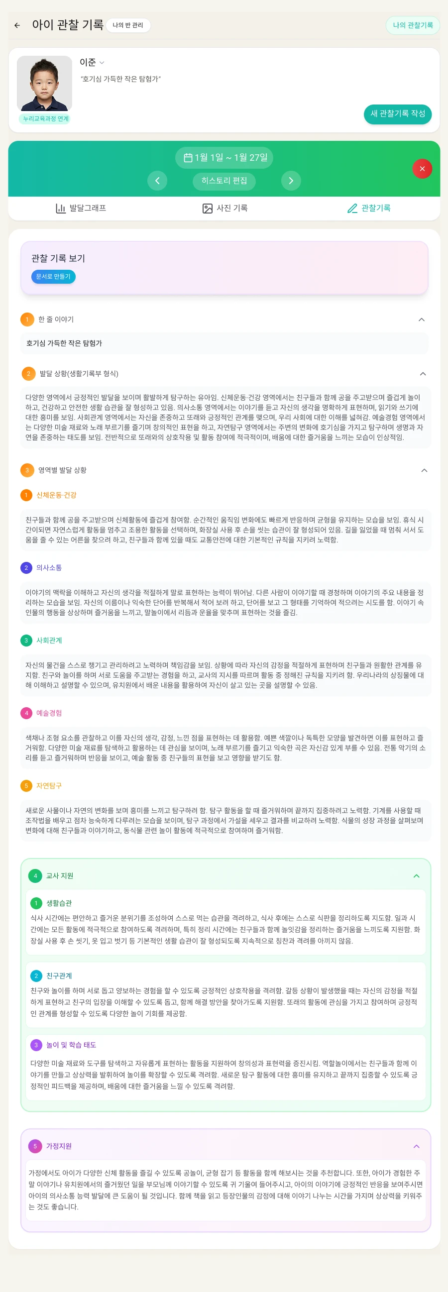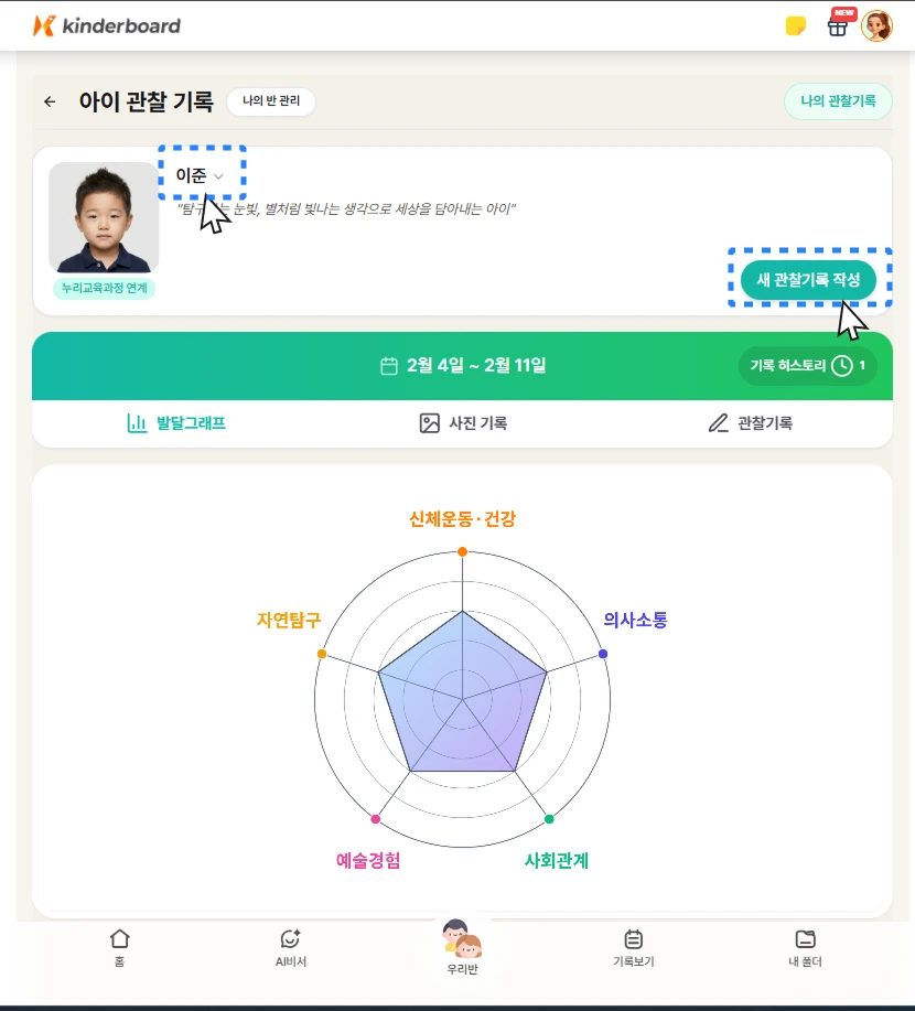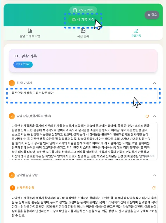 선생님이 입력한 지표와 실제 아이 기록을 기반해 관찰기록 초안을 생성해드립니다.