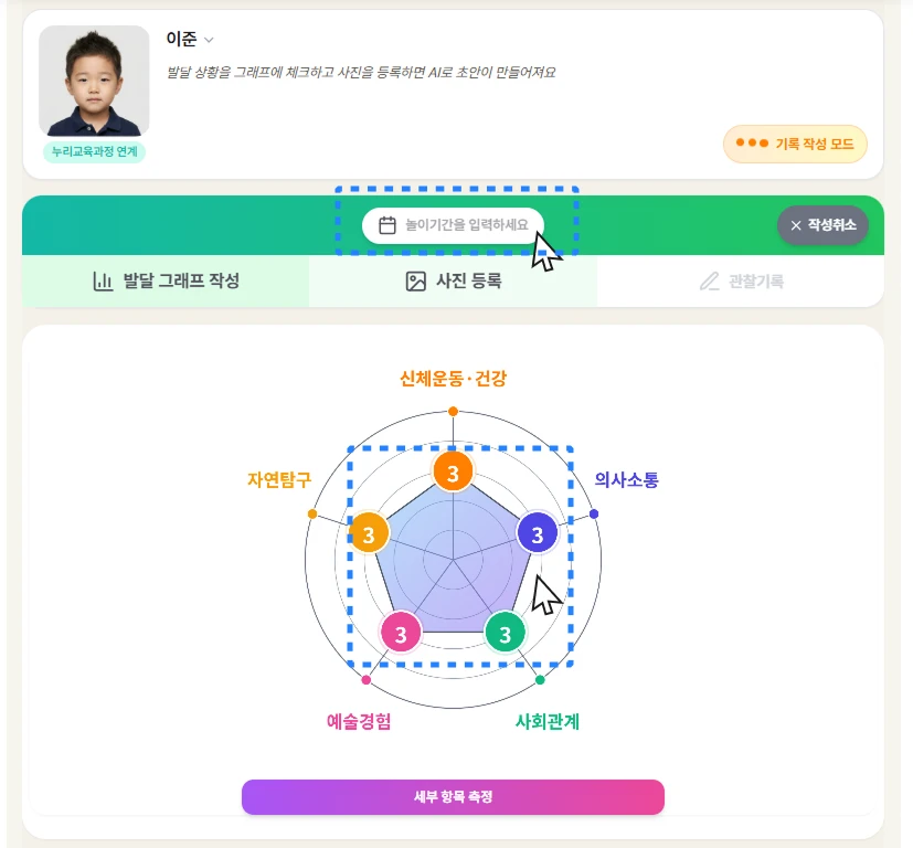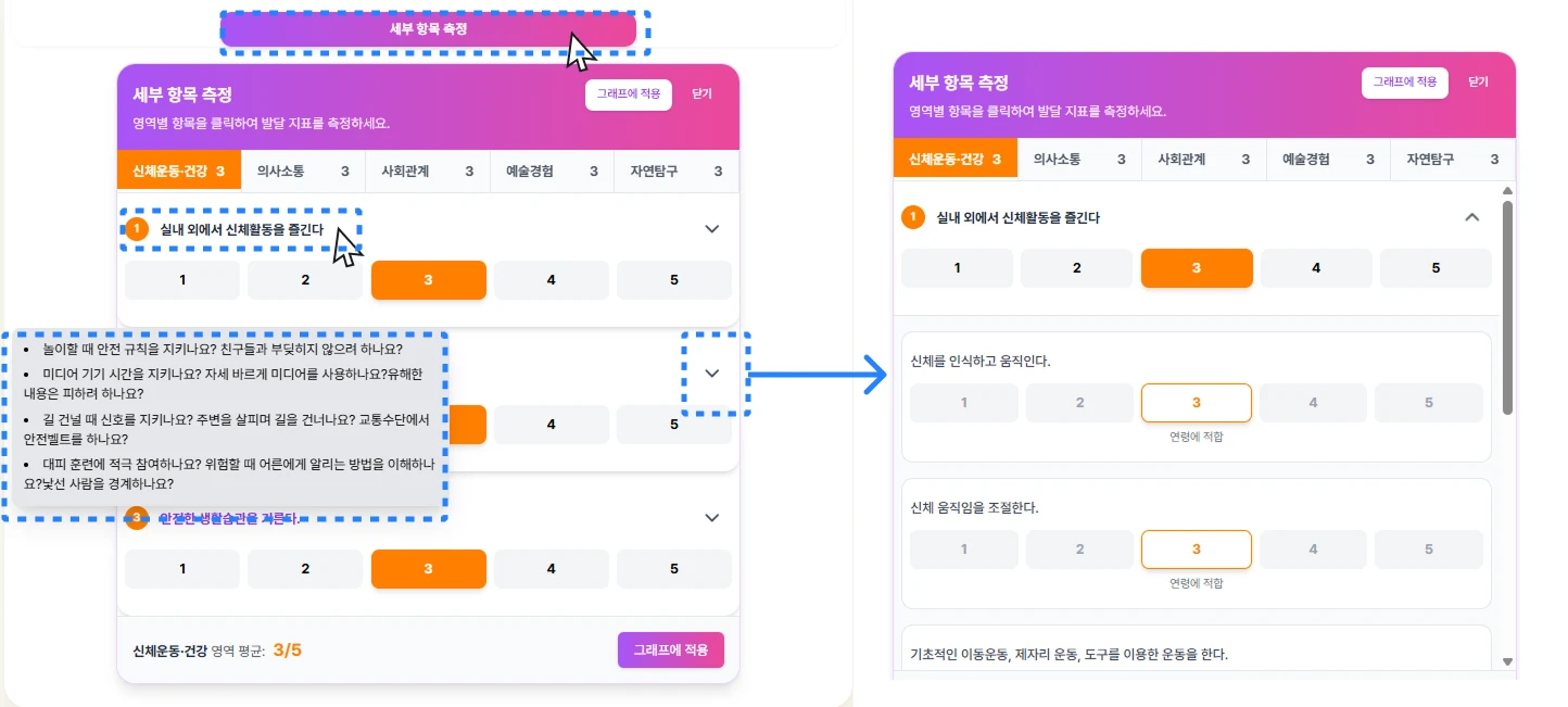 '아이 관찰 그래프' 하단의 ' 세부 항목 측정'을 클릭하시면, 유아 발달의 5대 영역별로 세부 평가를 진행하실 수 있어요.