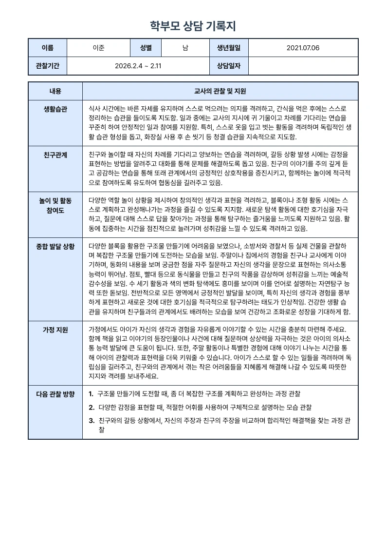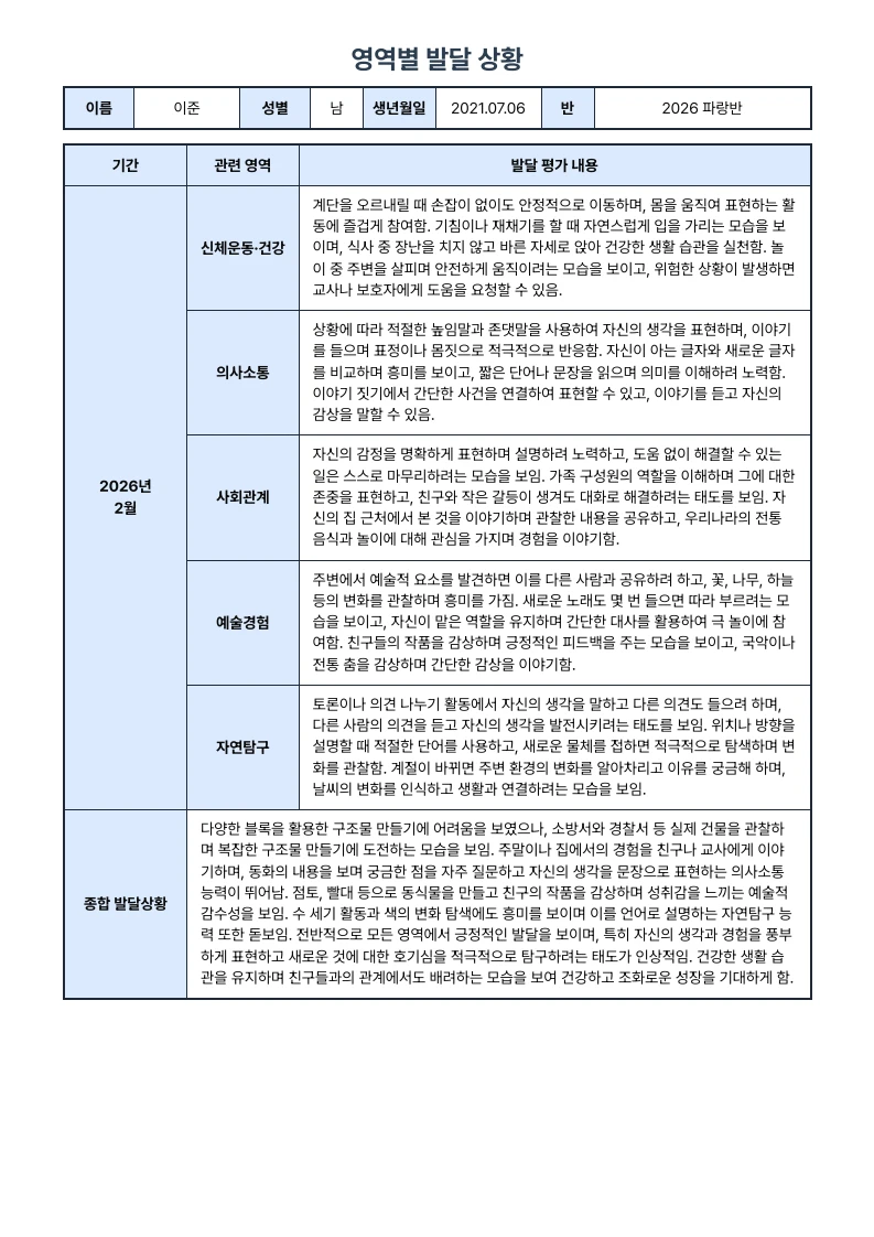 한줄 요약, 생활기록부 형식, 영역별 발달 상황, 교사 지원 및 가정 지원내용을 포함해요