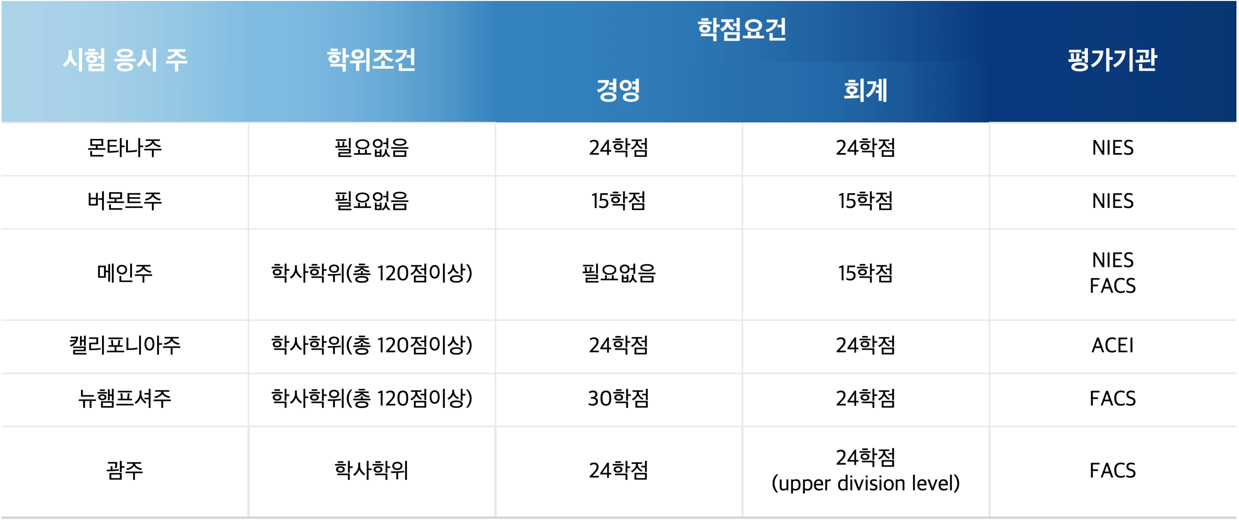 한국에서 취득한 학점들이 미국대학기준에서 인정할 수 있는지 여부를 검증받는 학점평가(Evaluation)을 받아야하지만, 각 주마다 인정하는 평가기관들이 다르므로 본인이 응시하고자 하는 주가 인정한 학점평가 기관에 따라 응시자격 여부가 크게 차이납니다.
