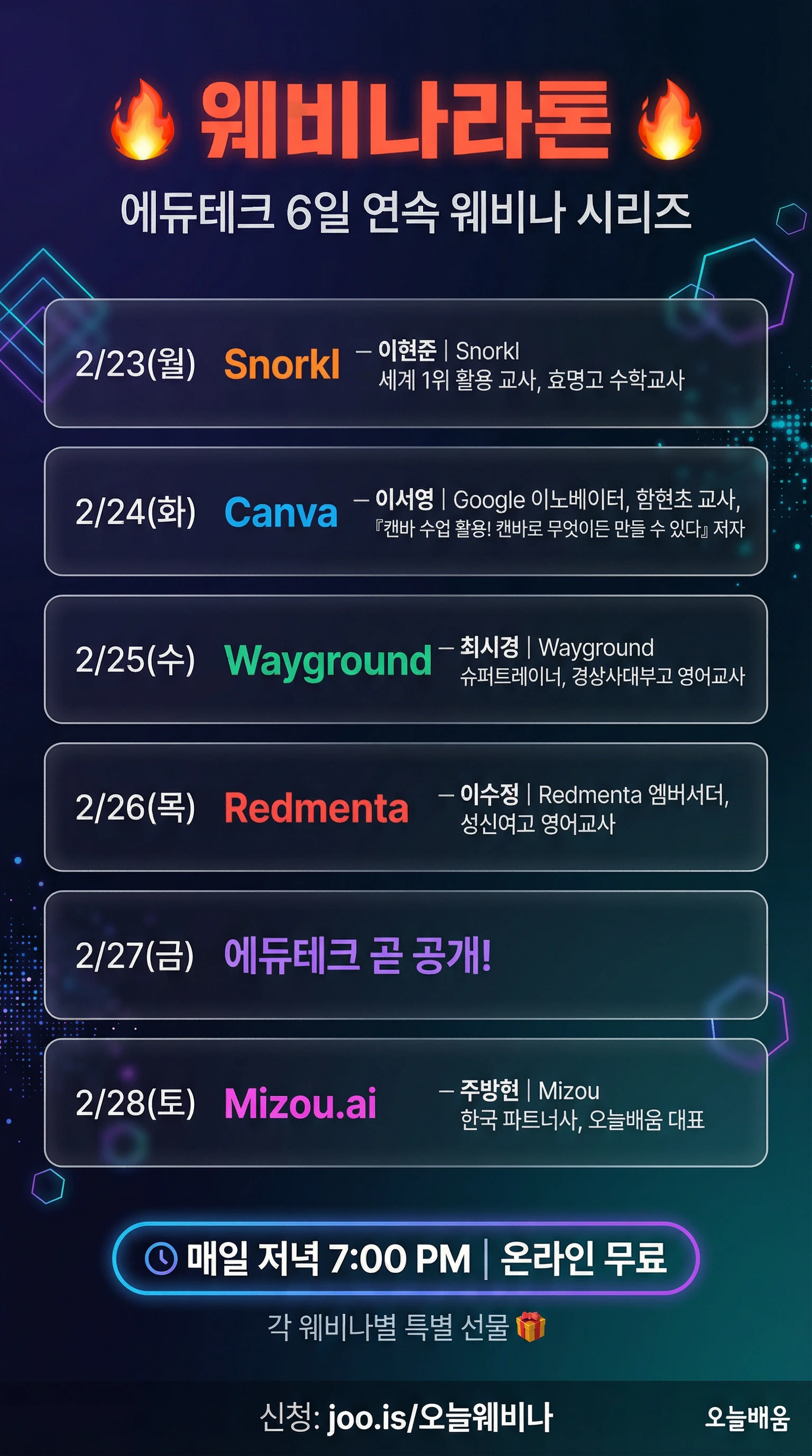 에듀테크 수업 활용법이 궁금하신 선생님, 2월 23일부터 28일까지 6일 연속 무료 웨비나라톤에서 Snorkl, Canva, Wayground, Redmenta, Mizou.ai까지 현장 교사들의 실전 노하우를 만나보세요.