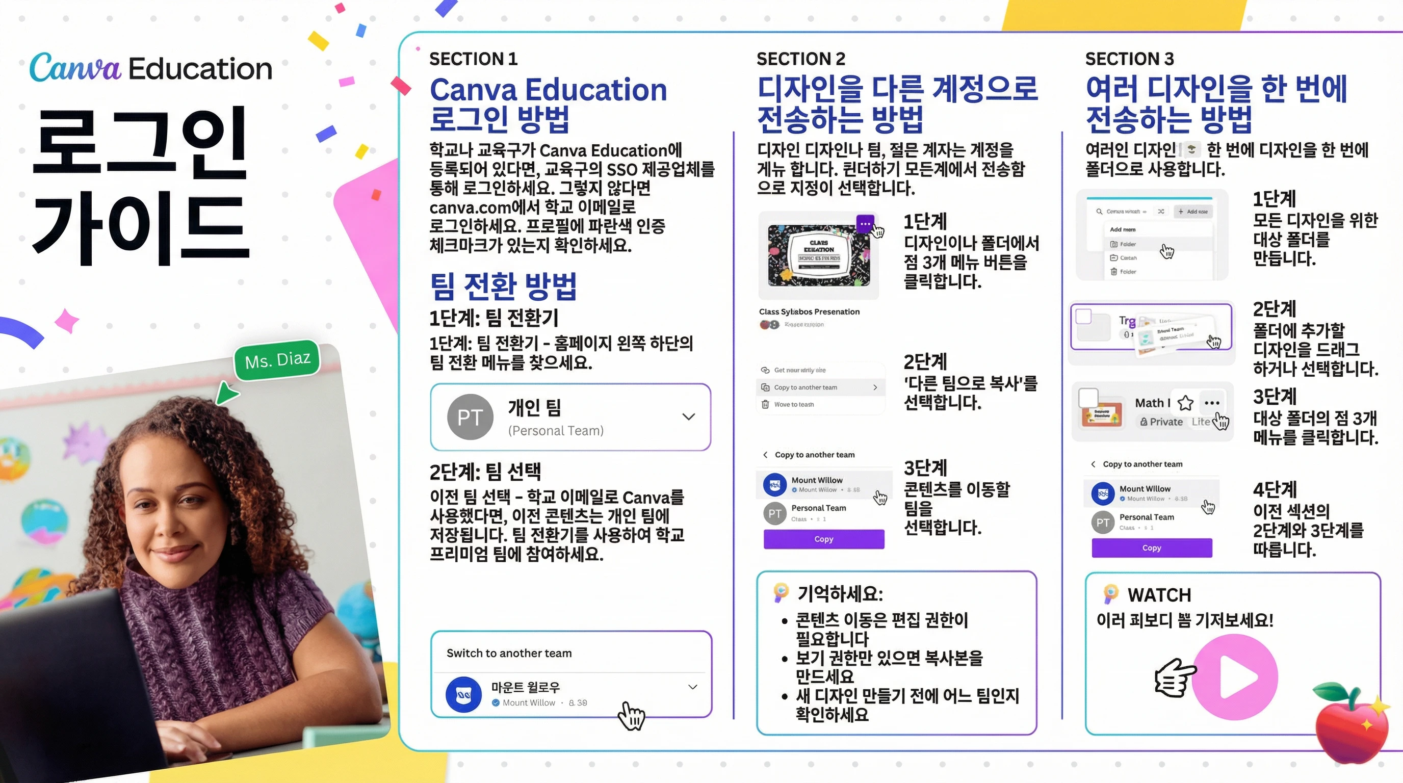 "삭제된 게 아닙니다. 접근 권한이 사라진 겁니다." 새 학기가 시작되고 학교가 바뀐 뒤 가장 많이 듣는 말입니다. "선생님, 예전에 만든 수업 자료가 안 보여요…" Canva Education을 학교 계정으로 사용했다면 학교 이동·계약 종료·졸업 전에 반드시 해야 할 작업이 있습니다. 왜 자료가 갑자기 안 보일까요? Canva는 두 가지 개념으로 나뉩니다. 계정(Account) = 로그인 이메일 팀(Team) = 학교 작업 공간 학교 이메일로 만든 디자인은 그 학교 '팀' 안에 저장됩니다. 학교가 바뀌면 이전 학교 팀 접근 권한이 종료되고 디자인도 함께 보이지 않게 됩니다. 삭제된 것이 아니라 접근 권한이 사라진 상태입니다. 가장 안전한 방법 개인 계정으로 미리 복사해 두세요 학교를 옮기기 전에 반드시 해두는 것이 좋습니다. 방법
