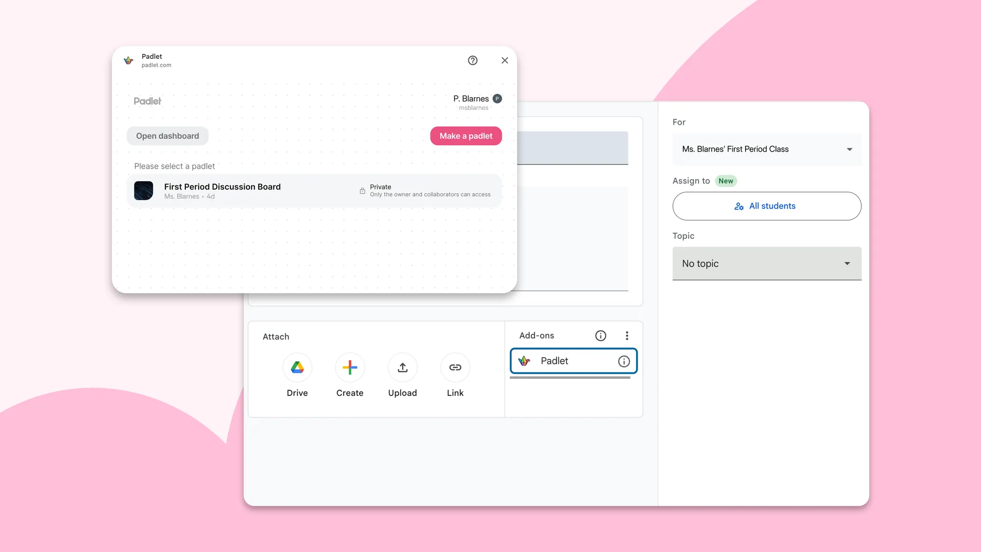 이미 Google Classroom도 쓰고 있고, Padlet도 쓰고 계시죠. 그 사이에서 링크를 복사해 붙이고, 공유 설정을 바꾸고, 점수를 옮겨 적는 일까지… 손이 많이 가는 작업이 계속 생깁니다. 우리는 Padlet이 기존 수업 흐름과 충돌하는 게 아니라, 자연스럽게 녹아들길 원했습니다. 그래서 두 도구 사이에서 정보가 자유롭게 오갈 수 있도록 Google Classroom 연동 기능들을 새롭게 만들었습니다. 무엇이 바뀌었나요? 몇 가지가 추가되었습니다. 먼저 Google Workspace for Education과 Google Classroom을 통한 rostering(사용자 및 수업 자동 연동)기능이 생겼습니다. 또 Google Classroom 안에서 바로 Padlet 과제를 붙일 수 있는 애드온도 추가했습니다. 마지막으로, 평가가 끝나면 점수를 성적표로 바로 보내는 성적 연동(grade passback) 기능도 지원합니다. Rostering이 뭔가요? 왜 중요한가요? 솔직히 말하면 이름은 별로지만, 기능은 정말 편합니다. 학생 한 명 한 명을 Padlet에 직접 추가하지 않아도 되는 기능입니다. 이번에 추가된 연동은 두 가지이고, 역할이 다릅니다. Google Workspace for Education은 사용자 기준 연동입니다. 교사와 학생, 그리고 역할 정보가 Padlet에 자동으로 동기화됩니다. 새 학생이 들어오면 자동으로 추가되고, 반이 바뀌면 그 정보도 바로 반영됩니다. Google Classroom은 수업 기준 연동입니다. Google Classroom에서 만들어둔 수업이 그대로 Padlet 클래스에 반영됩니다.