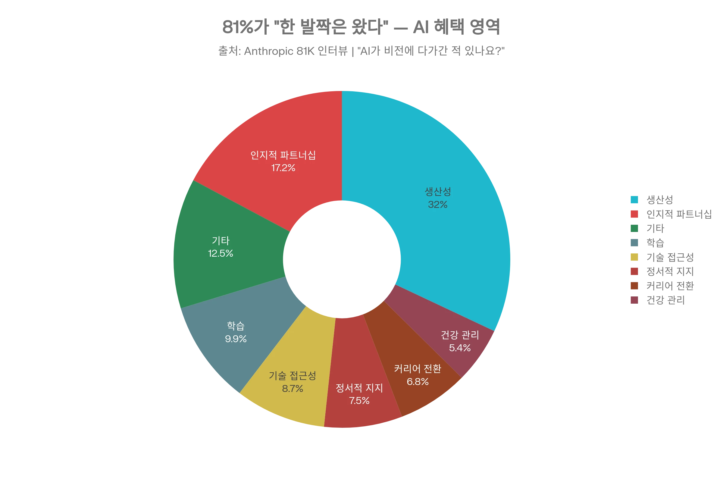 "AI가 당신의 비전에 한 발짝이라도 다가간 적 있나요?"라는 질문에 81%가 "그렇다"고 답했습니다. 가장 많이 언급된 영역은 생산성(32%), 인지적 파트너십(17.2%), 학습(9.9%) 순이었습니다.