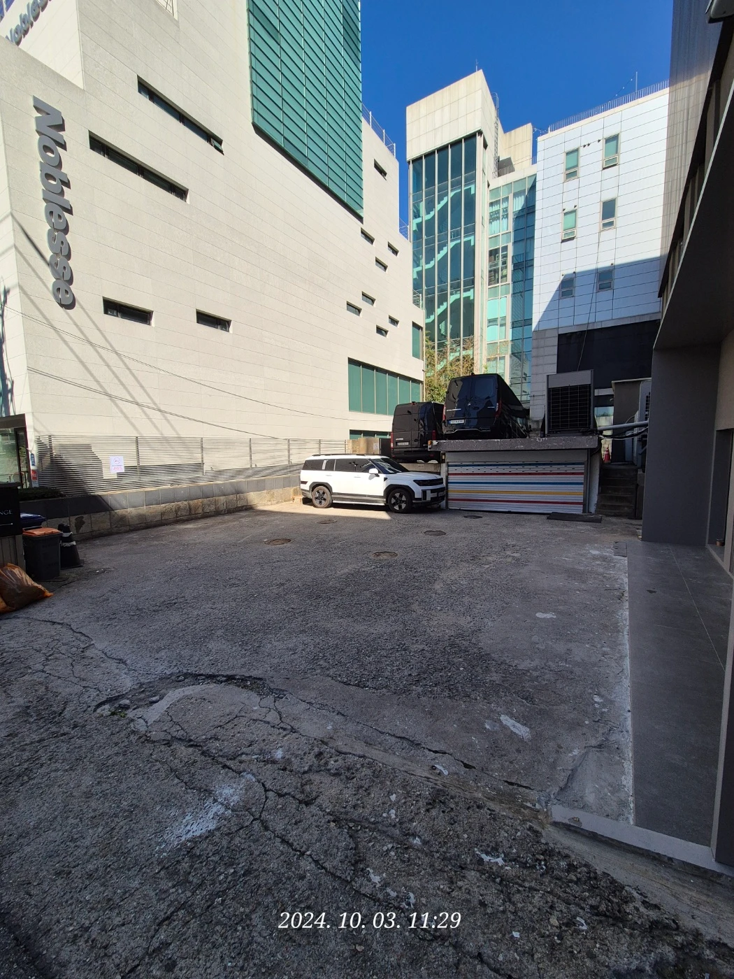 건물을 돌아 경사면으로 20미터 걸어내려오면 우측에 지상주차장에 입구가 있습니다.