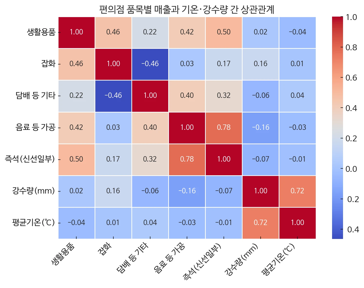 담배 등 기타 | -0.06 | +0.04 | 기온과 약한 양의 상관 |
