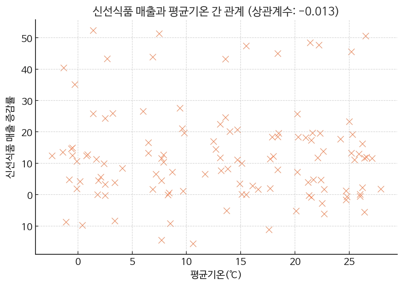 평균기온(℃) vs 신선식품 매출 | -0.013 | 0.888 | 상관 거의 없음, 통계적으로 유의하지 않음 |