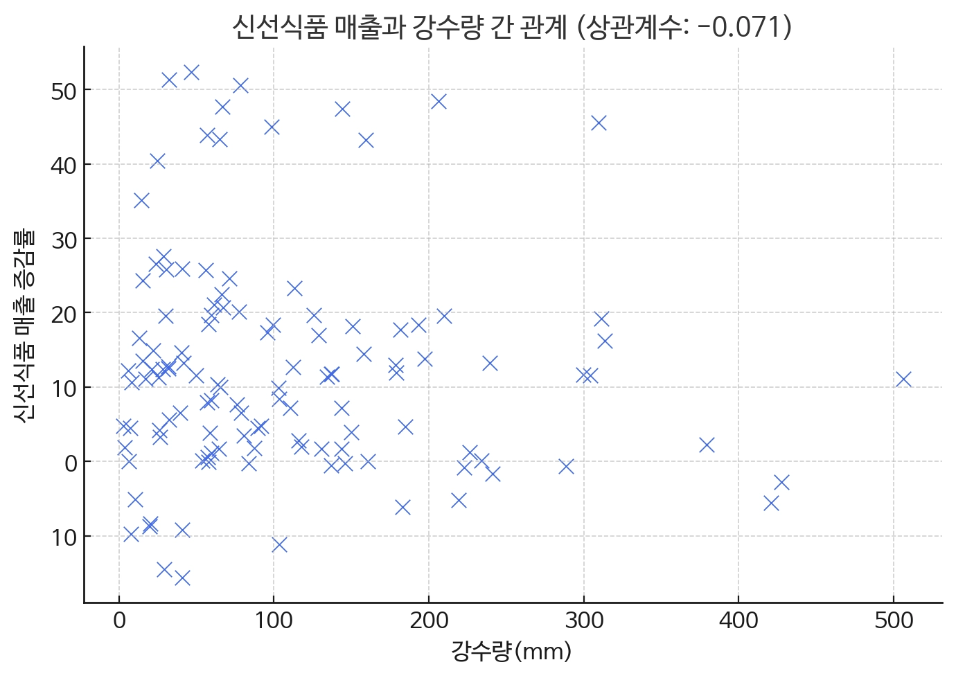 강수량(mm) vs 신선식품 매출 | -0.071 | 0.441 | 약한 음의 상관, 통계적으로 유의하지 않음 |