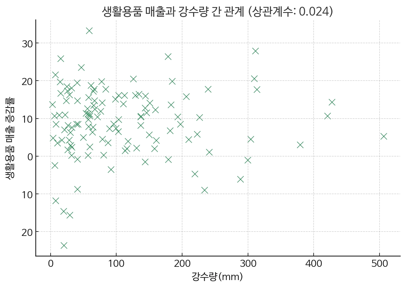 생활용품 ↔ 강수량(mm) | +0.024 | 0.791 | 상관 거의 없음, 통계적으로 유의하지 않음 |