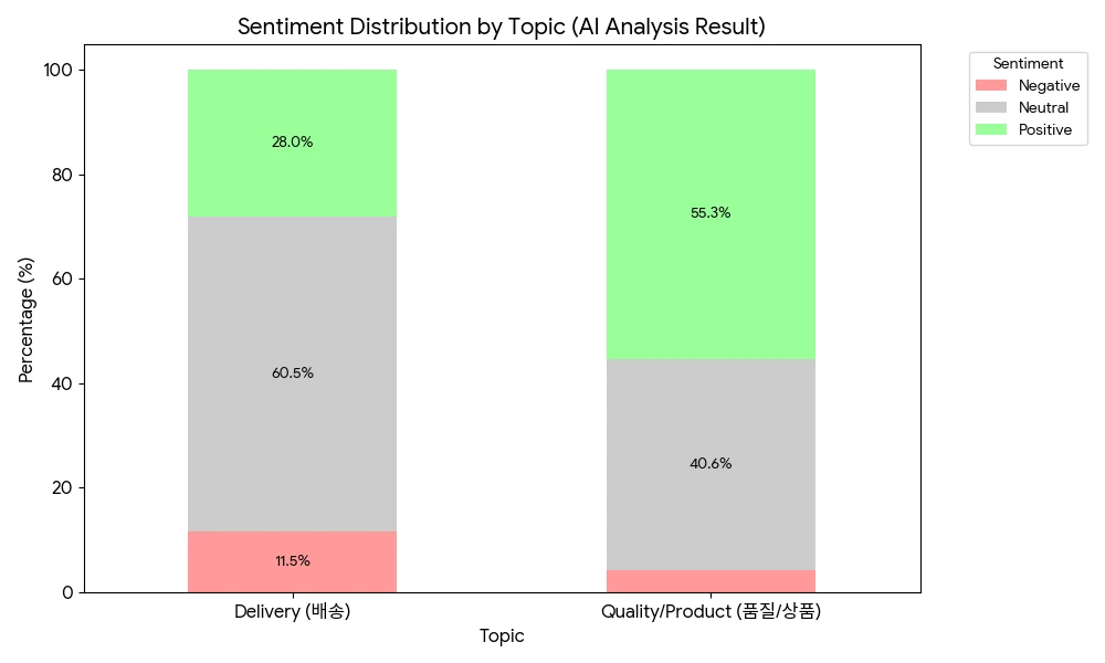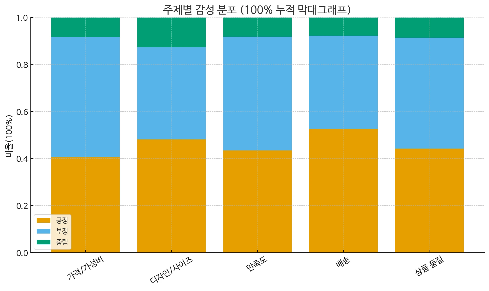 **[주제별 감성 분포]를 100% 누적 막대그래프(Stacked Bar Chart)**로 시각화해줘.