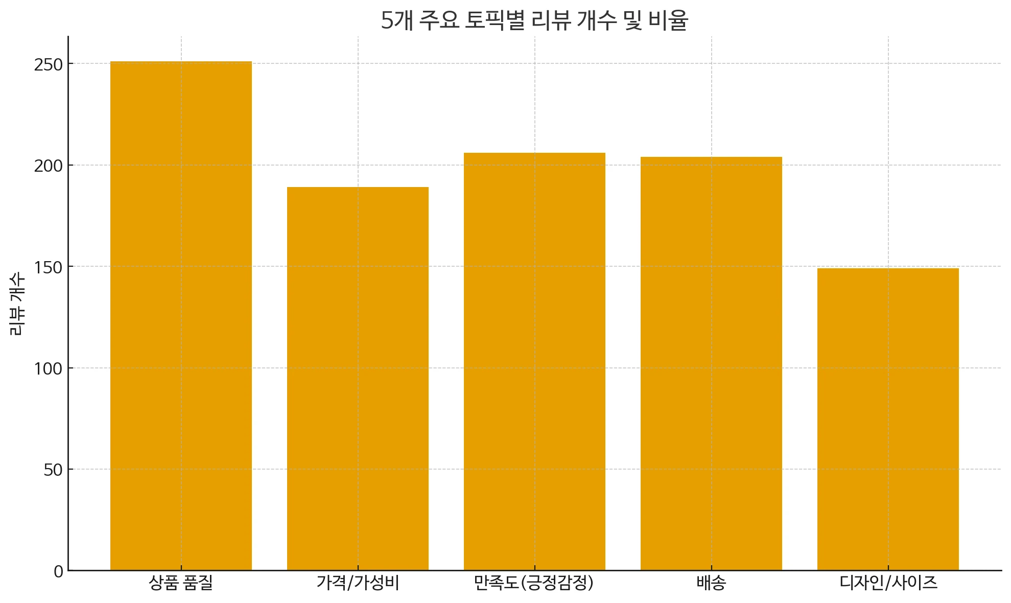 전체 리뷰 텍스트를 분석해서 주요 주제(Topic)를 5가지 카테고리로 분류해줘.