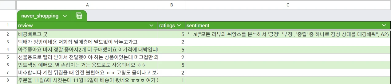 =ai("모든 리뷰의 뉘앙스를 분석해서 '긍정', '부정', '중립' 중 하나로 감성 상태를 태깅해줘", A2)/************************************