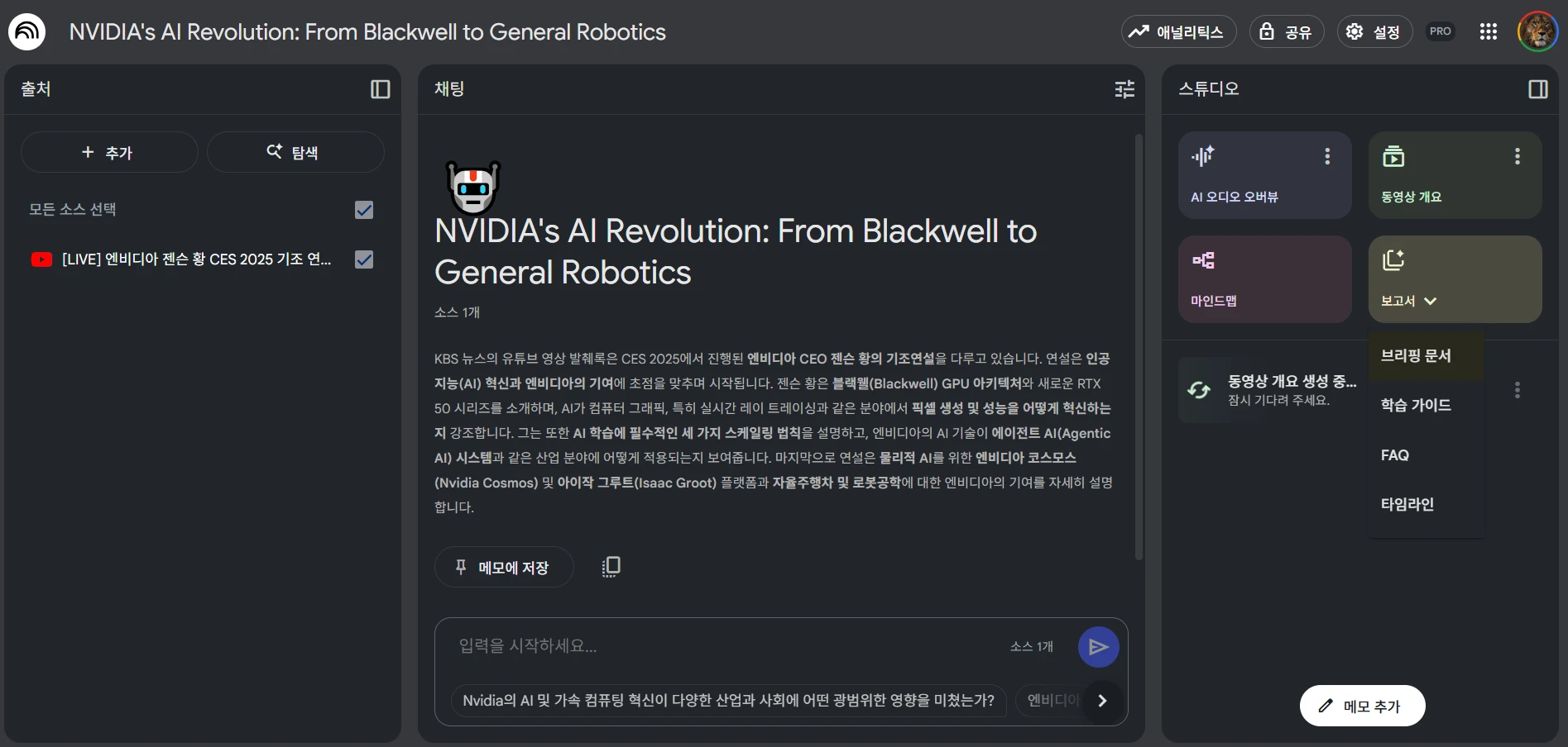 브리핑 문서, 학습 가이드, FAQ, 타임라인