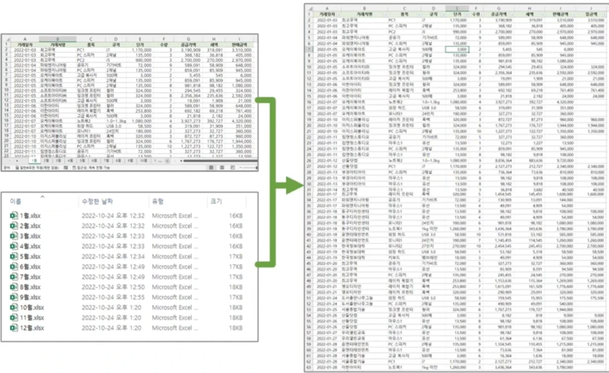 을 Dash Board 소스로 활용하거나, 피봇테이블 소스로 활용할 경우에, 시트를 추가해서 통합하는 노가다(?) 작업을 할 필요없음