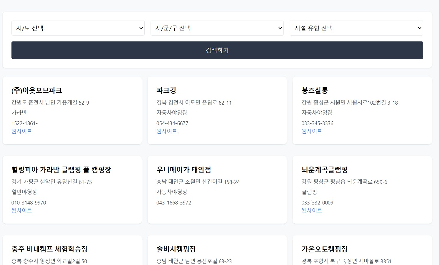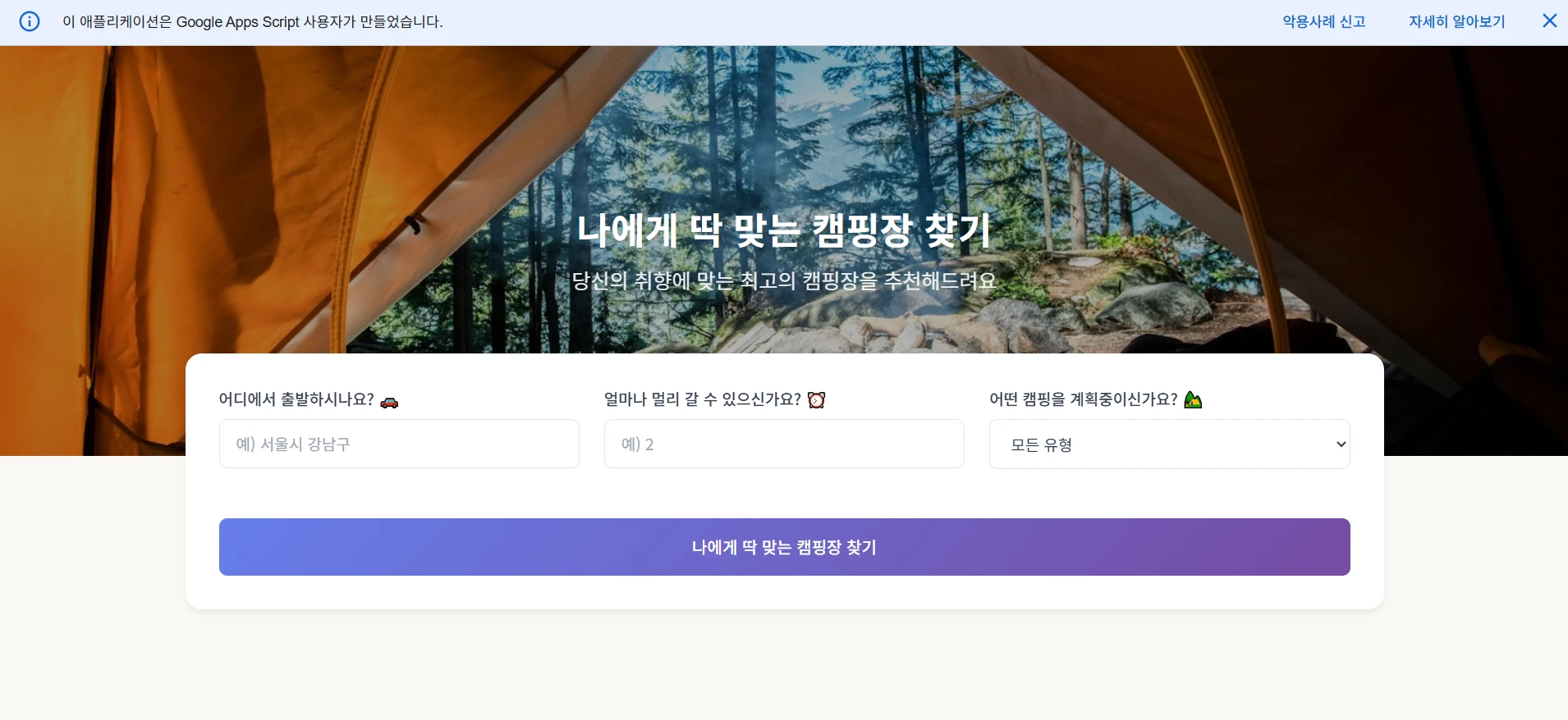 </html>공공데이터를 활용한 웹서비스를 만들거야. google apps script로 코딩할거고, 다른 복잡한 방법은 쓰지 말아줘. 공공데이터 API 키는 ~~이야. 캠핑장 데이터이고 웹서비스에서 캠핑장 데이터를 조회할 수 있어야 하고, 지역이랑 캠핑 유형을 필터링 할 수 있는 기능을 넣어줘. 웹서비스에서 한국어로 보여줘야 하고 이쁘게 디자인해줘