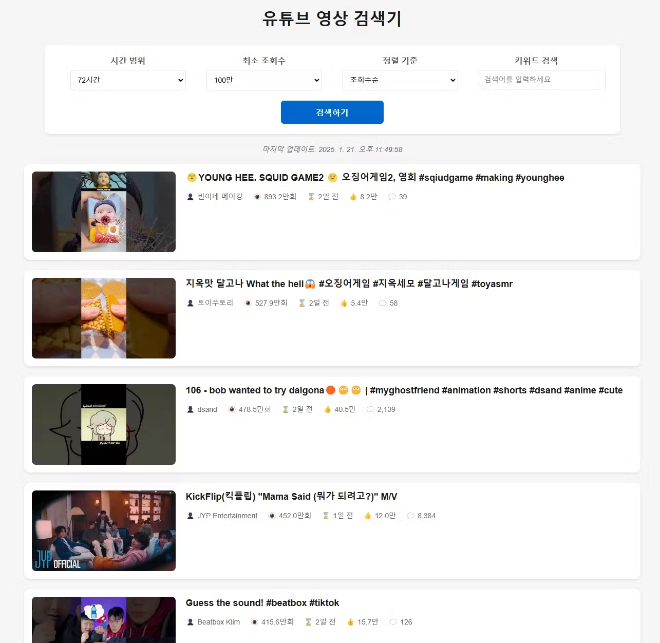 const searchUrl = \`https://www.googleapis.com/youtube/v3/search?part=snippet&type=video&order=viewCount&publishedAfter=${timeAgoISOString}®ionCode=KR&maxResults=50&key=${API_KEY}\`;
