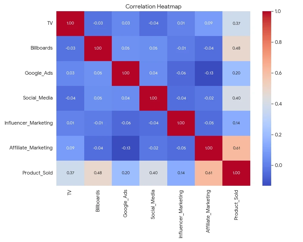 모든 광고비 관련 수치형 변수를 독립변수로 사용해