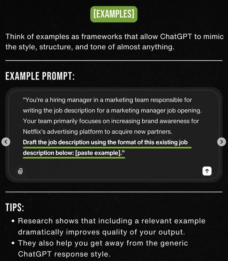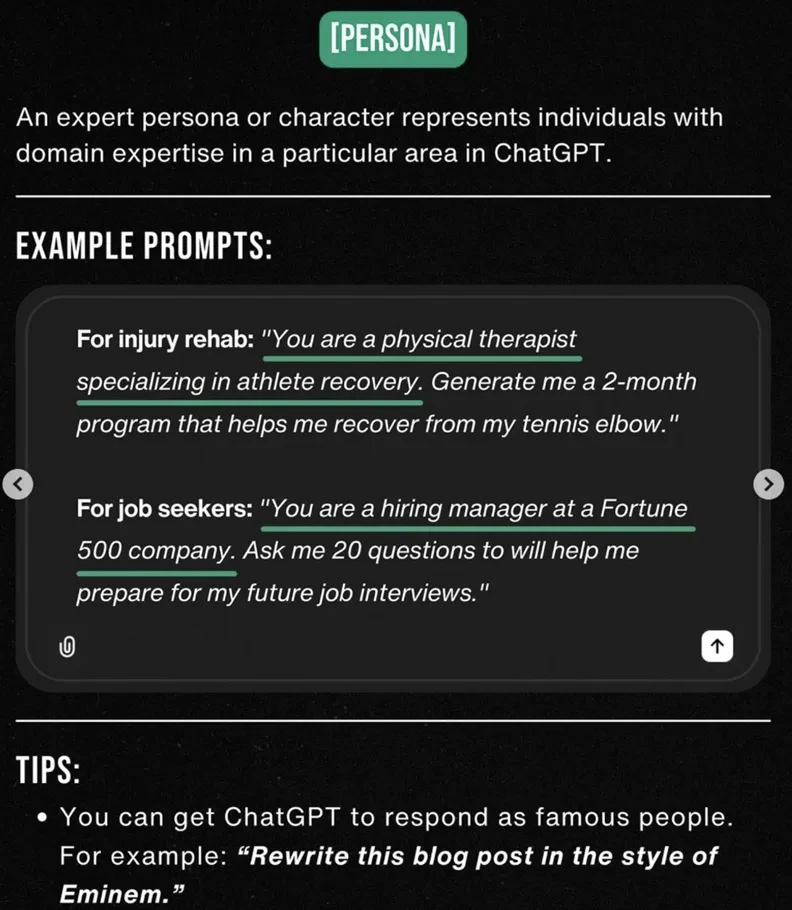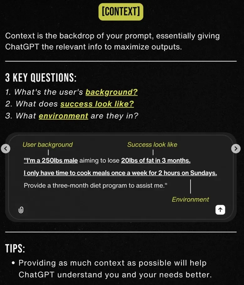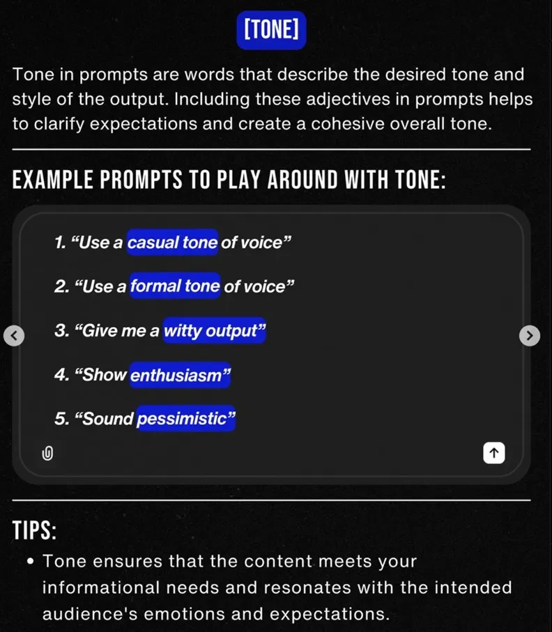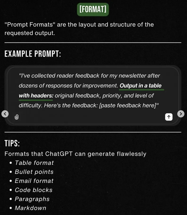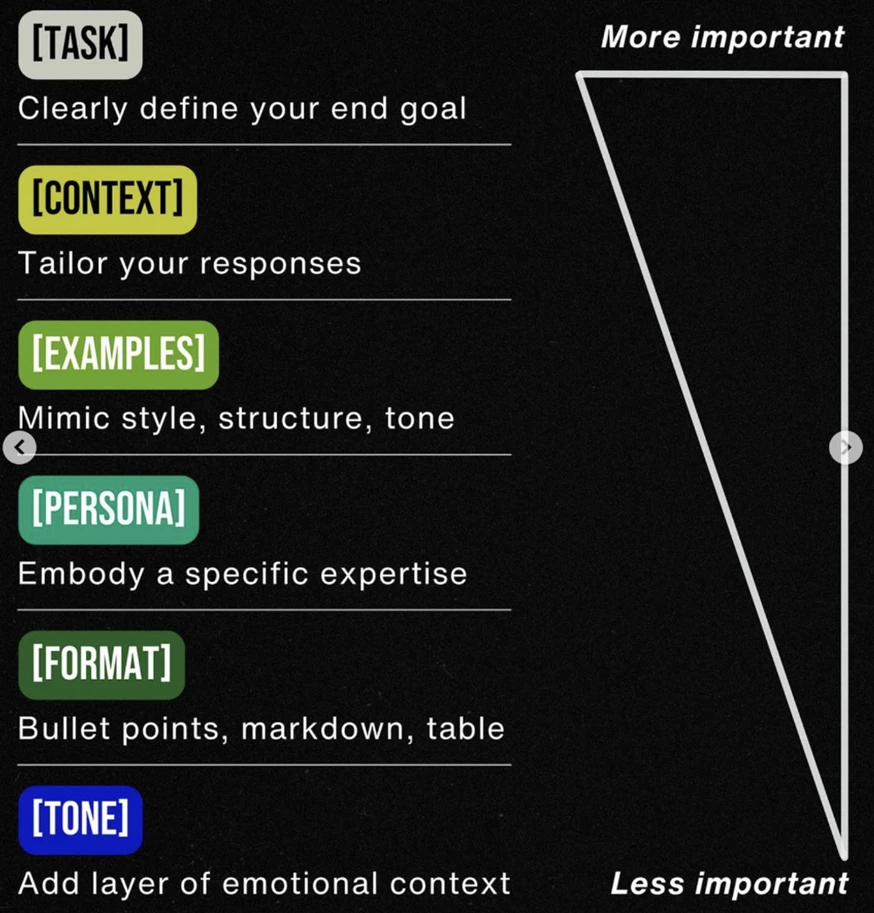 •[TASK] - 명확한 목표 정의 •[CONTEXT] - 맥락/상황 전달 •[EXAMPLES] - 글의 스타일, 구조, 어조 등의 예시 보여주기 •[PERSONA] - 상황극, 역할극 시연 •[FORMAT] - 결과물 형식. 글머리 기호, 마크다운, 표 등 •[TONE] - Tone & Manner | *Source : https://maily.so/ai.lab/posts/37cde2ab |