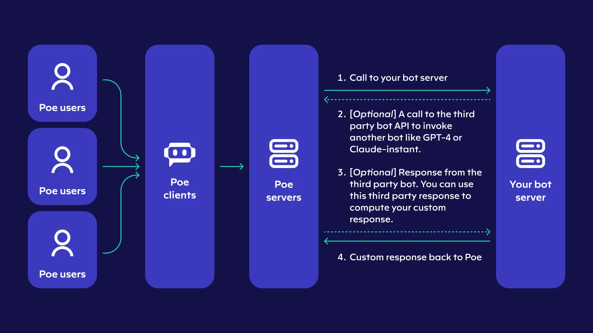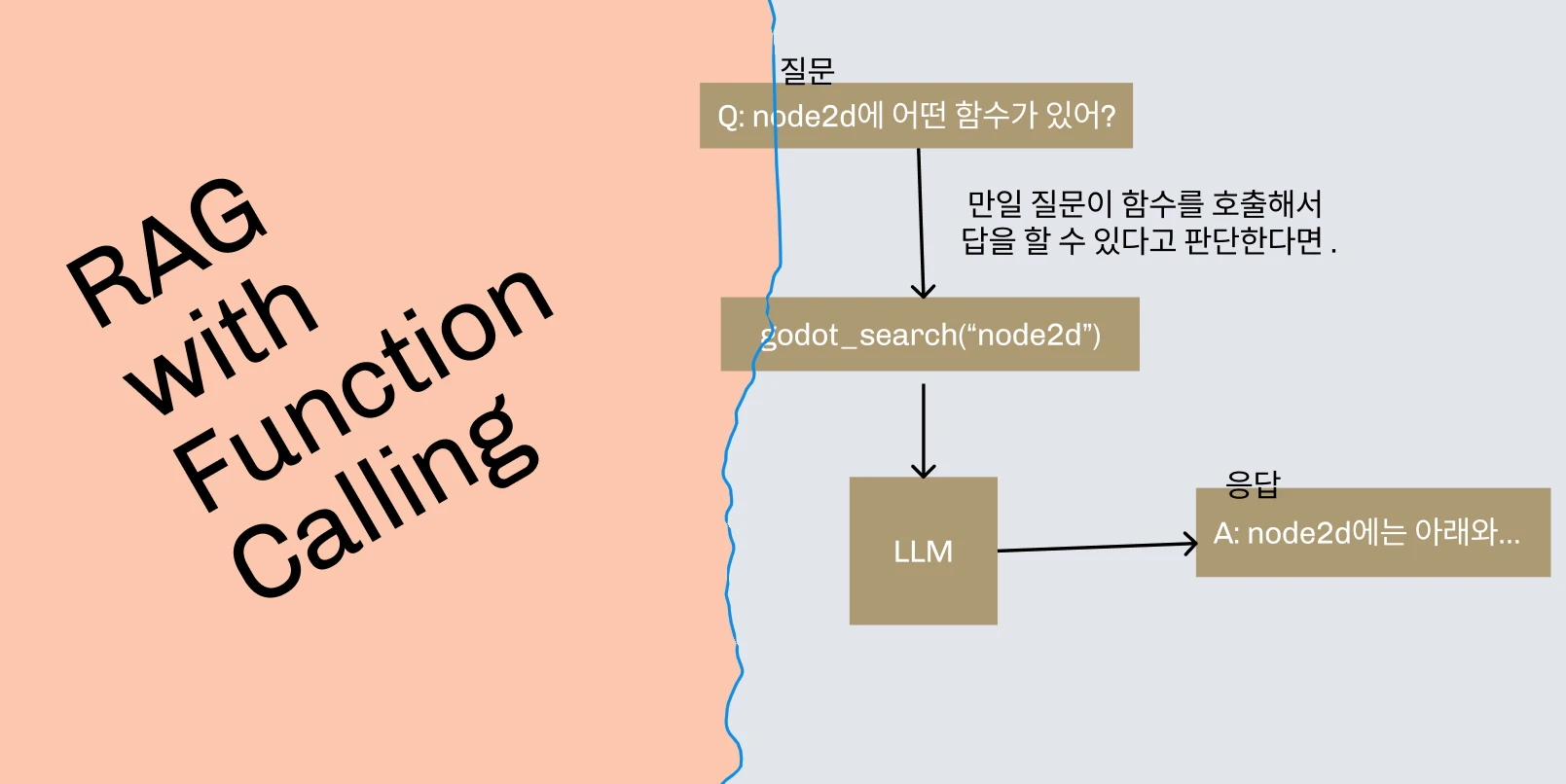 소개 Poe 기반 서버봇 Poe? Poe는 "Platform For Open, Exploration"의 약자로, 질문과 답변을 주고받는 유명한 웹사이트인 Quora에서 개발한 챗봇 소프트웨어입니다. Poe는 다양한 AI 챗봇을 편리하게 이용할 수 있는 환경을 제공합니다. Server Bot 프롬프트 봇과 서버봇 제공 검색 결과를 기반으로 응답을 생성해야 되기 때문에 서버봇 활용 Godot-4.2-Copilot Poe 기반 서버 봇 고도엔진 4.2 공식 문서 를 수집하고 검색하는 시스템 구현 검색 API를 function call로 연동 (RAG with Function call) RAG(Retrieval Augmented Generation) 검색 결과를 응답 생성 LLM에 주입해 결과를 고려한 응답을 생성하게 한다. RAG with Function calling Function calling의 역할 질의에 따라 godot_search 함수 호출해서 응답할지 아닐지 결정
