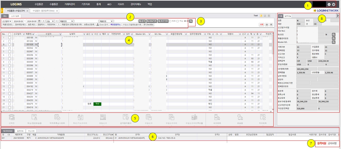- 제출번호, 수입사, HAWB, MAWB, 해외거래처, 세번부호등