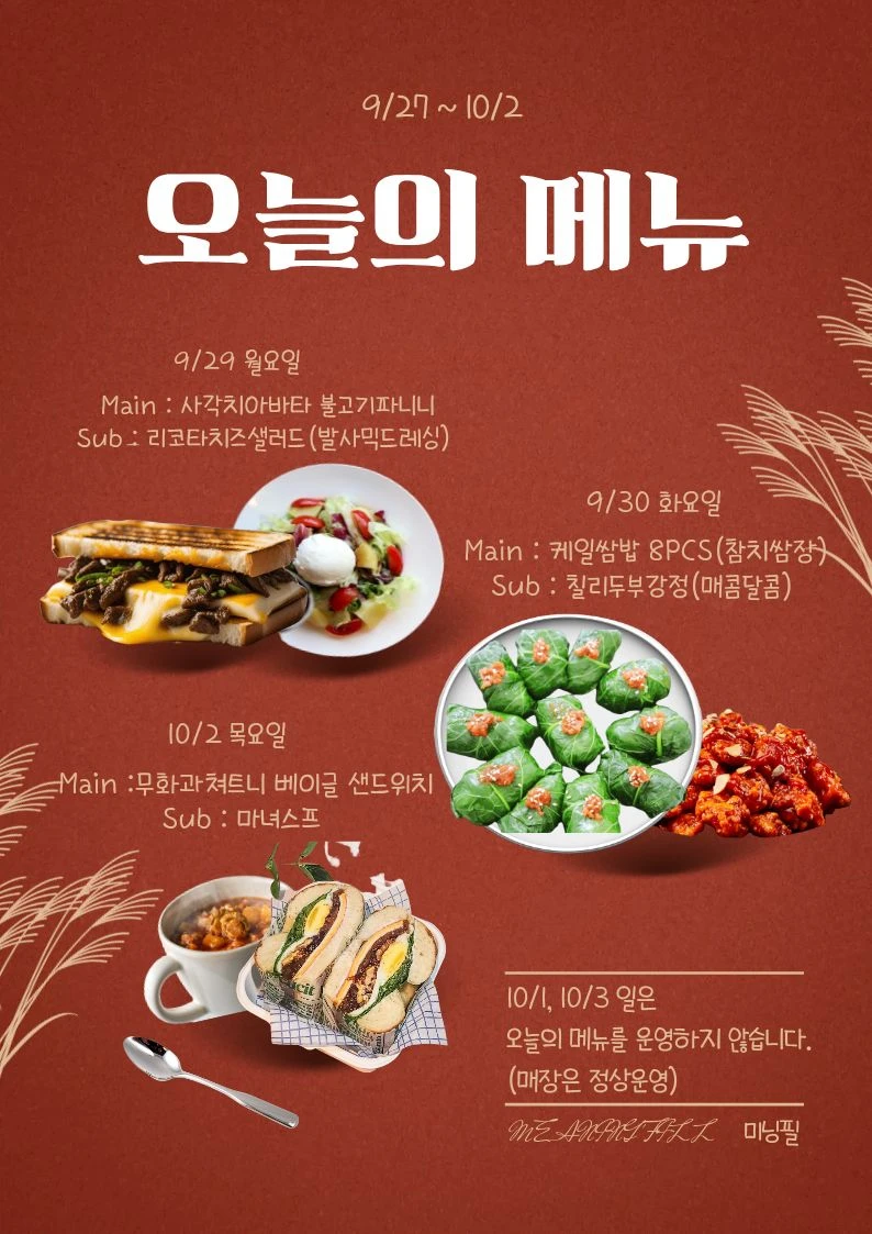 9월 29일 ~ 10월 2일 메뉴