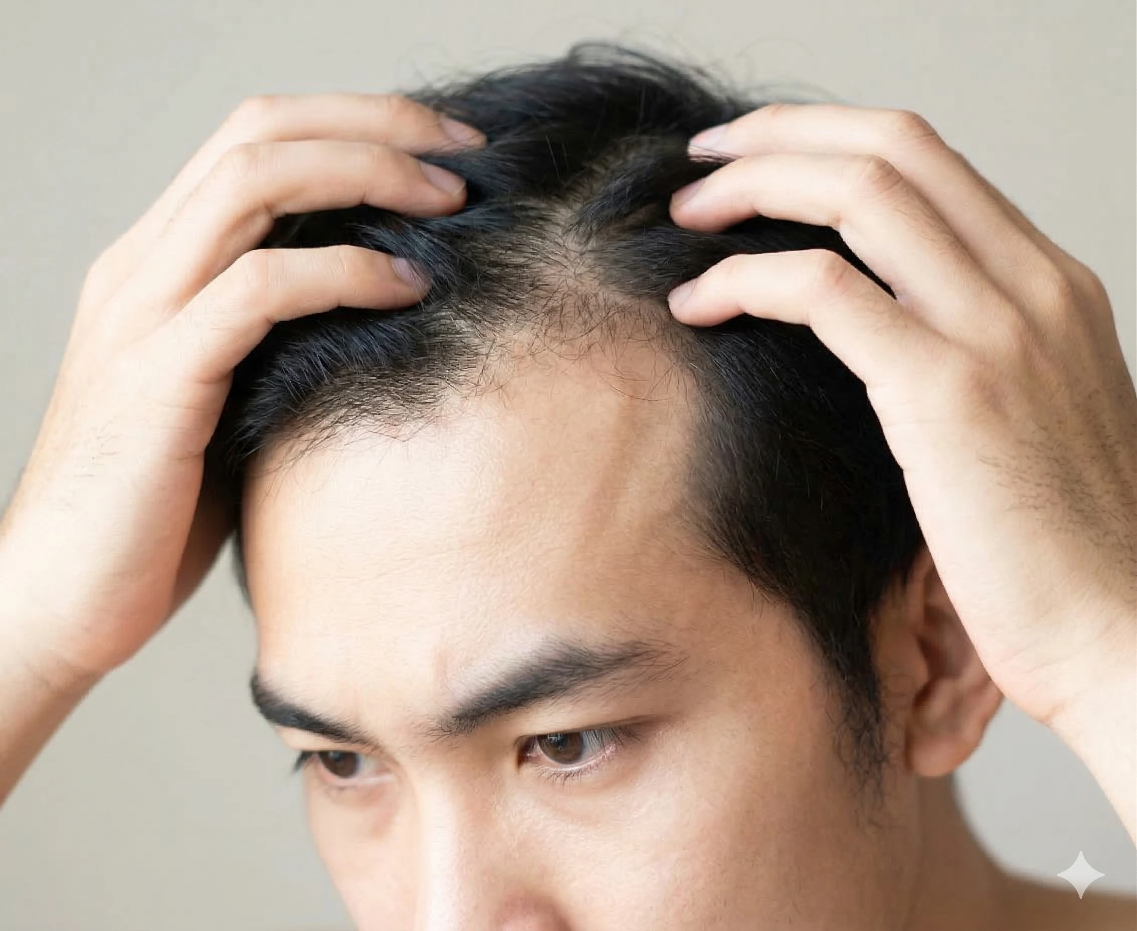 [Đỉnh đầu/Đường chân tóc] Khi soi gương thấy đường ngôi tóc rộng ra, phần da đầu ở đỉnh đầu bắt đầu lộ rõ.