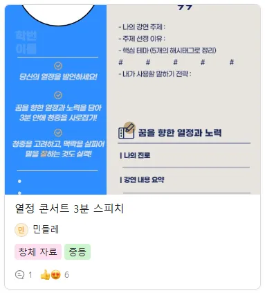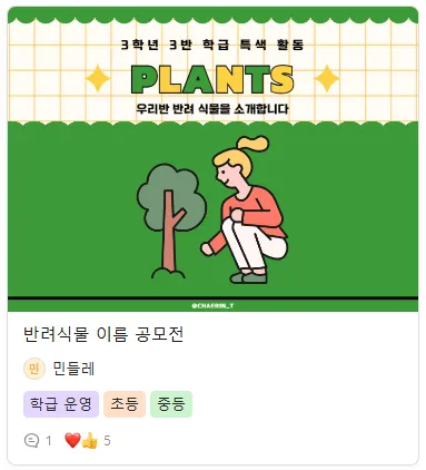 🥰 우리 학교 선생님 초대 이벤트 아직 미리캔버스 교사 커뮤니티를 모르시는 선생님들이 계신가요? 미리캔버스 교사 커뮤니티를 널리널리 알려주세요! 초대한 선생님도 1개월 Pro 이용권 ❤️ ! 초대받은 선생님도 1개월 Pro 이용권도 함께 🎁 이벤트 내용 : 초대한 선생님이 첫 게시글을 작성하면 선착순 50분을 대상으로 1개월 Pro 이용권을 드려요. 참여 규칙 : 초대받은 선생님의 첫 게시글 작성 혜택 내용 : 1개월 미리캔버스 무료 구독권 (선착순 50분) 가장 먼저 받는 전국의 선생님들이 공유하는 수업자료, 연구회 아이디어 이벤트 기간 : 5/17 ~ 선착순 50분 만료 시점 게시글 목록 : 초등 교과자료 공유 미캔 AI 활용 사례 게시글을 작성하는 방법은 해당 링크를 참고해주세요! 참고사항 작성해야주실 내용은 '첫 댓글'이 아닌 '첫 게시글' 인점 확인 부탁드립니다 🙇♂️ 한 선생님께서 여러 선생님을 초대해주시면 초대한 선생님 당 1개월 이용권을 드립니다! (중복참여가능) 초대 받으신 선생님께서 첫 게시글을 작성시, 초대 이벤트 참여로 혜택이 제공되며 '첫 게시글 이벤트' 중복 참여가 불가합니다. 🎁 인증 및 혜택 받는 방법