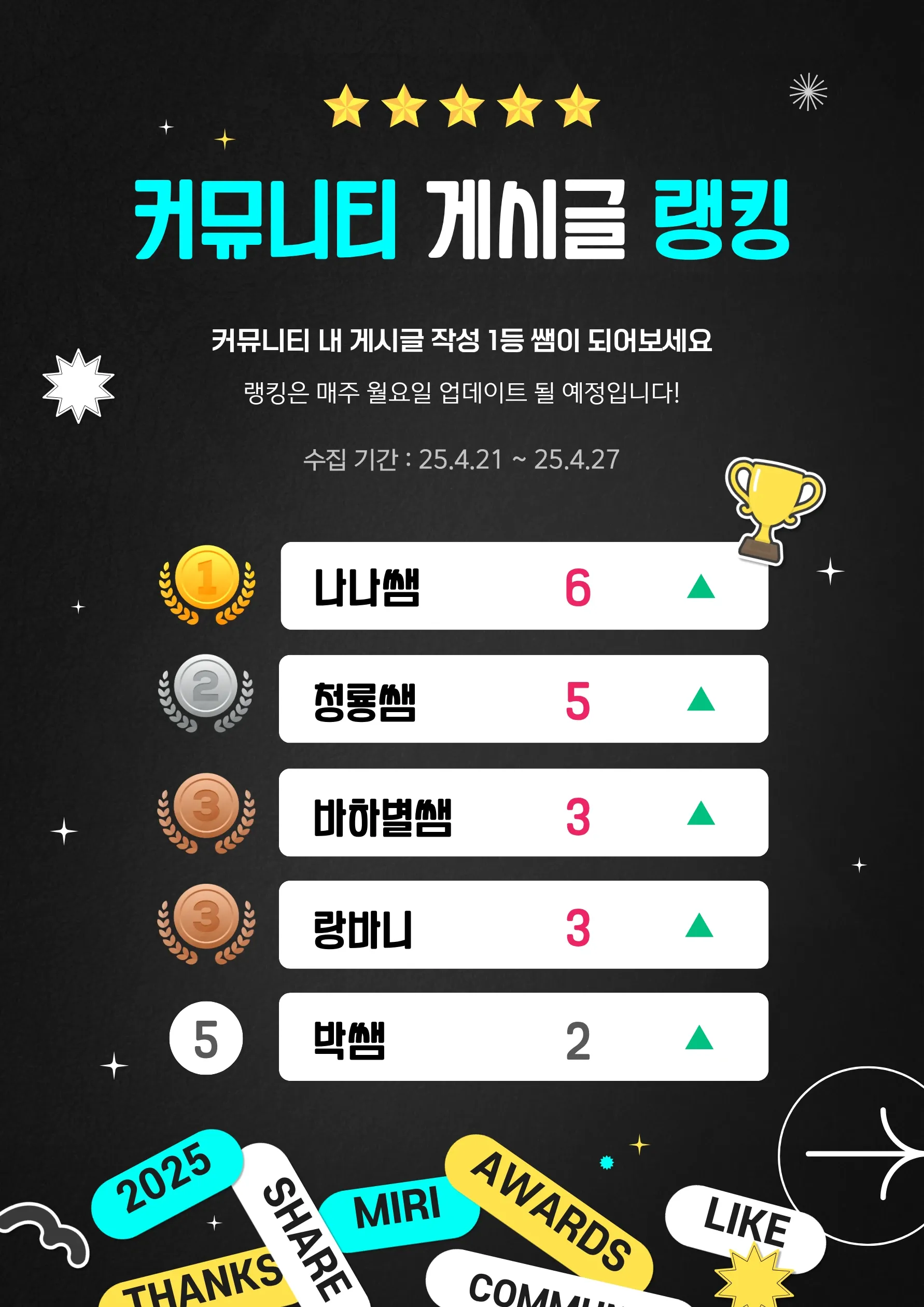 🥰 우리 학교 선생님 초대 이벤트 아직 미리캔버스 교사 커뮤니티를 모르시는 선생님들이 계신가요? 미리캔버스 교사 커뮤니티를 널리널리 알려주세요! 초대한 선생님도 1개월 Pro 이용권 ❤️ ! 초대받은 선생님도 1개월 Pro 이용권도 함께 🎁 이벤트 내용 : 초대한 선생님이 첫 게시글을 작성하면 선착순 50분을 대상으로 1개월 Pro 이용권을 드려요. 참여 규칙 : 초대받은 선생님의 첫 게시글 작성 혜택 내용 : 1개월 미리캔버스 무료 구독권 (선착순 50분) 가장 먼저 받는 전국의 선생님들이 공유하는 수업자료, 연구회 아이디어 이벤트 기간 : 5/17 ~ 선착순 50분 만료 시점 게시글 목록 : 초등 교과자료 공유 미캔 AI 활용 사례 게시글을 작성하는 방법은 해당 링크를 참고해주세요! 참고사항 작성해야주실 내용은 '첫 댓글'이 아닌 '첫 게시글' 인점 확인 부탁드립니다 🙇♂️ 한 선생님께서 여러 선생님을 초대해주시면 초대한 선생님 당 1개월 이용권을 드립니다! (중복참여가능) 초대 받으신 선생님께서 첫 게시글을 작성시, 초대 이벤트 참여로 혜택이 제공되며 '첫 게시글 이벤트' 중복 참여가 불가합니다. 🎁 인증 및 혜택 받는 방법