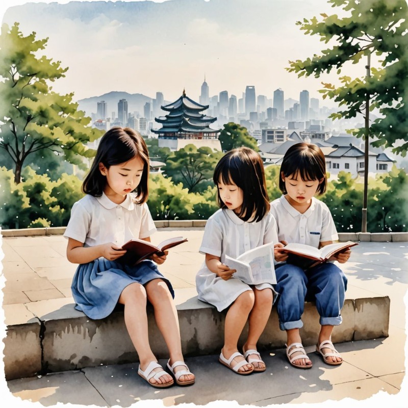 프롬프트 : 공부하는 한국의 서울 어린이들