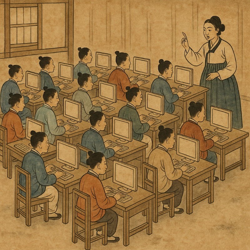 프롬프트 : 20명의 학생과 교실에서 컴퓨터 수업을 하고 있는 한 명의 여자 선생님