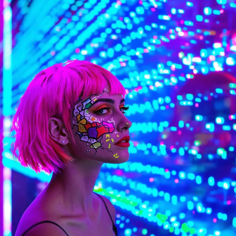 ํ๋กฌํํธ : ์งง์ ๋ค์จ ํํฌ ๋จธ๋ฆฌ๋ฅผ ๊ฐ์ง ์ ์ ์ฌ์ฑ, ์ผ๊ตด์๋ ํํ์์์ ํ์ธํธ๋ก ์ฅ์๋ ์ถ์์ ์ธ ๋ฌด๋ฌ๊ฐ ์๋ค. ๋ฐฐ๊ฒฝ์ ๊ฐ๋ ฌํ ํ๊ด์ ๊ทธ๋ผ๋ฐ์ด์