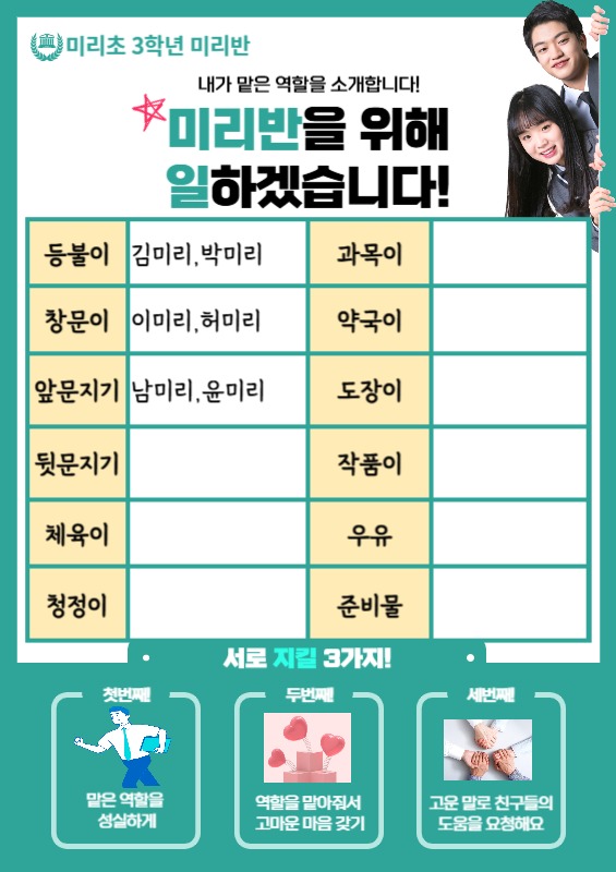 똑같은 1인 1역도 어떻게 제시해 주느냐에 따라 학생 참여도가 많이 달라지더라구요! 역할판을 이렇게 만들어주니 아이들이 한번이라도 더 관심 갖고 쳐다보고, 역할 수행에 진심입니다^^