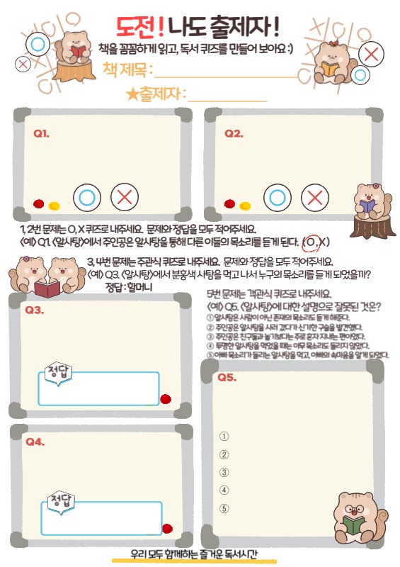 학생들과 책을 읽은 뒤 읽은 내용을 점검하며 다시 한 번 꼼꼼하게 읽게 해주는 독후 활동으로 독서퀴즈 문제 출제하기가 유용해요! 친구들이 출제한 문제를 다른 친구들이 푼다고 생각하면 책을 더 깊이 읽기도 한답니다. O, X문제, 주관식, 객관식 문제 모두 출제할 수 있도록 샘플 문제도 제시해두었어요~~