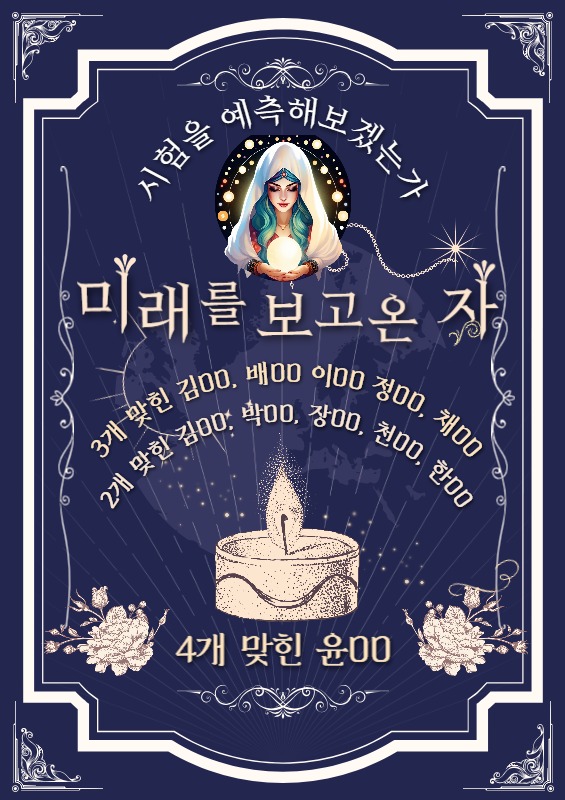 학생들에게 모의고사, 시험기간이 되면 자기 점수를 예측하게 해보는 이벤트를 진행하는데요, 예측 달성률이 높은 학생들의 명단을 위와 같이 게시합니다.