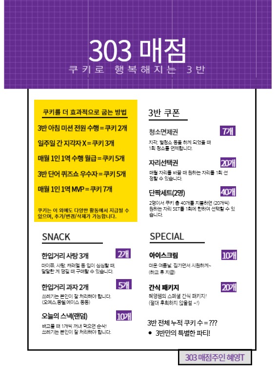 작년 한 해동안 아이들이 쿠키를 모아서 조금 더 재미있게 학교 생활을 하도록 교내 미니 매점을 열었습니다! 조금 더 실감나라고, 진짜 메뉴판처럼 만들어서 아이들이 사먹을 수 있게 했었는데, 꽤나 효과가 좋았던 기억이 납니다. ^^