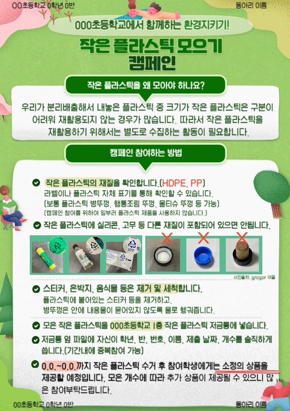 아이들과 환경교육 운영하며 진행할 수 있는 ‘작은 플라스틱 모으기’ 캠페인 자료입니다. 작은 플라스틱은 따로 분리배출하지 않으면 재활용이 어렵다고 하여 운영한 캠페인입니다. 캠페인 안내 자료를 큰 사이즈로 인쇄하여 전교생들이 참여할 수 있도록 안내하였습니다. 참여한 학생들에게는 작은 플라스틱을 녹여 만든 플라스틱 짜개를 작은 상품으로 전달했습니다.