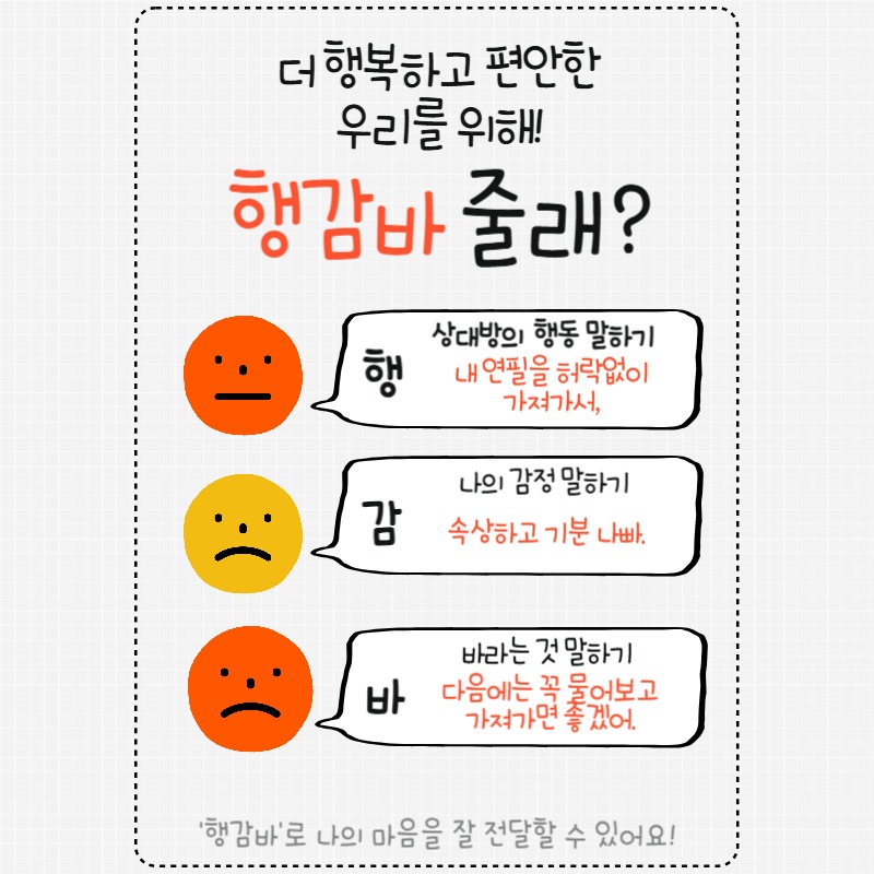 플로터로 인쇄해서 교실에 게시해두고 아이들간에 갈등이 생길때마다 함께 보기도 하고 자주 안내해주면 좋아요. 유치하다고 생각할 수도 있지만 어떻게 말해야 할지 모르는 아이들이 많아서 도움이 됩니다.