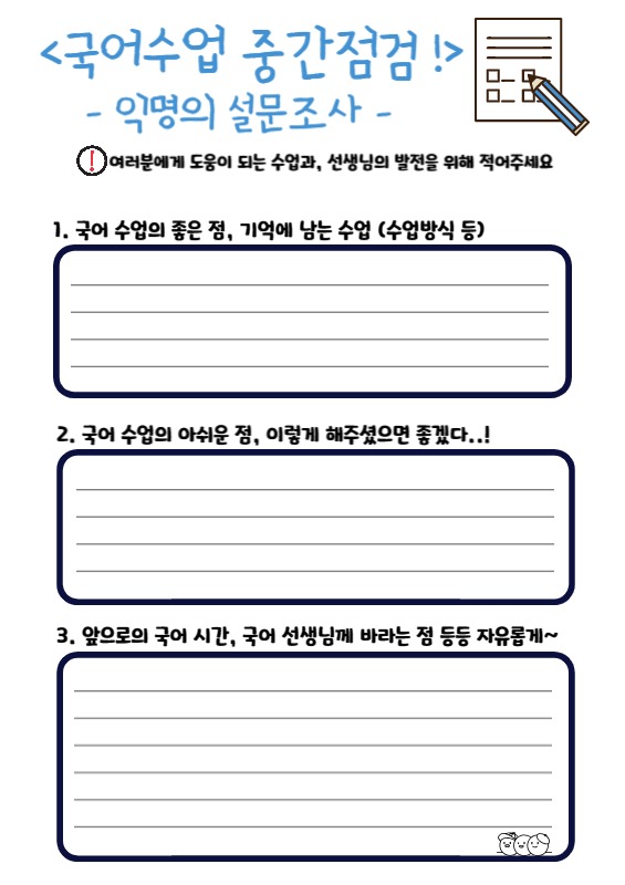 과목에 맞게 바꾸어 익명의 설문조사 한 번 해보시는걸 추천드려요😁
