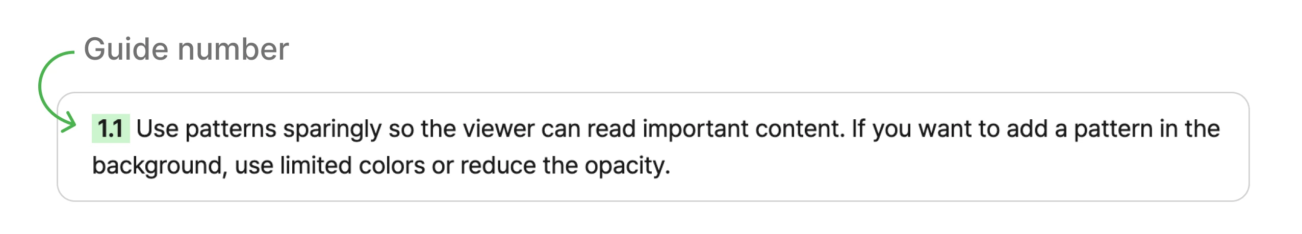 Guide numbers ## (highlight in green) match the checklists in our internal design guide, which we use to decide if submitted designs are approved or rejected.