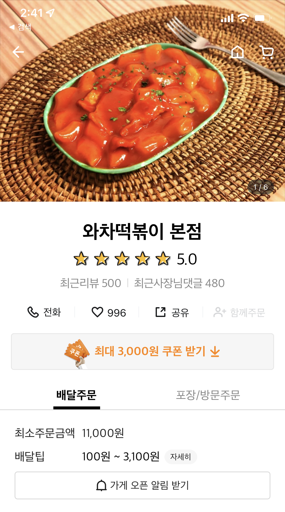 1️⃣ 특징 꾸덕한 쌀떡볶이 비주얼에 비해 맵지 않고 살짝 달달한 맛 속이 꽉찬 튀김 저렴한 가격 2️⃣ 추천 메뉴 [갓성비 조합] 와차세트 (떡볶이 1 + 순대 1 + 튀김 소 + 음료 1) 3️⃣ 링크 https://baemin.me/sCpLJnyOo